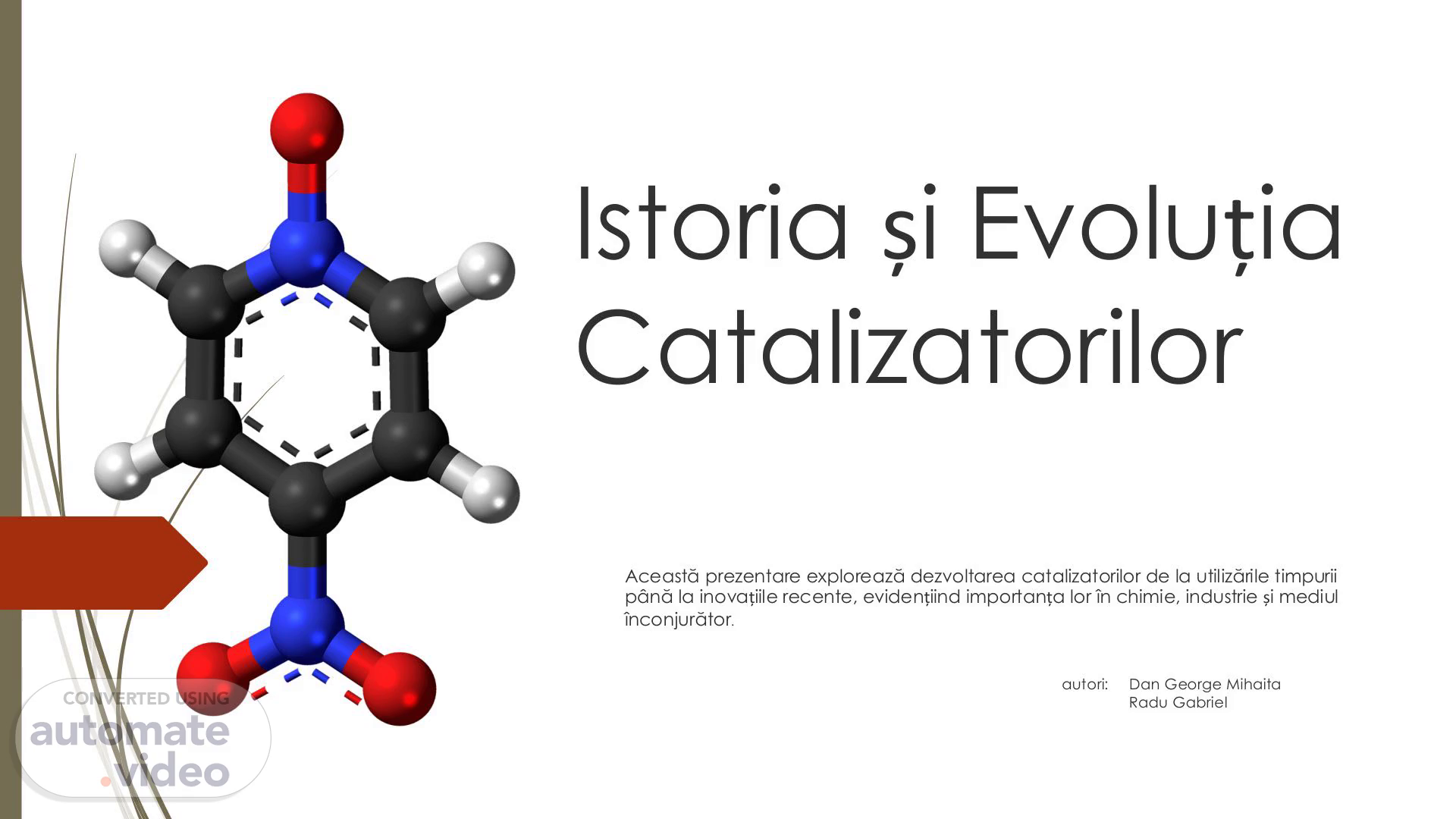 [Audio] Istoria și Evoluția Catalizatorilor Această prezentare explorează dezvoltarea catalizatorilor de la utilizările timpurii până la inovațiile recente, evidențiind importanța lor în chimie, industrie și mediul înconjurător. autori: Dan George Mihaita Radu Gabriel.