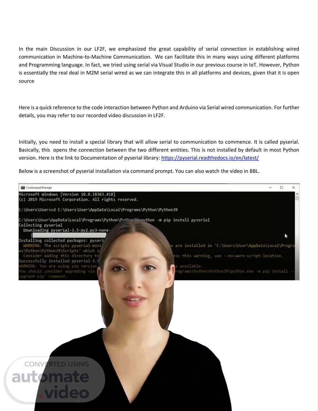 [Virtual Presenter] Welcome to our training video on the importance of serial connection in wired communication for Machine-to-Machine Communication. We will be discussing the key role of serial connection and how Python, along with the pyserial library, can help integrate it on various platforms and devices. This is the first slide of our presentation where we will cover the benefits of using Python for M2M serial communication. In our previous IoT course, we experimented with serial connection on Visual Studio, but we have found that Python is the most suitable option due to its compatibility with all platforms and devices, thanks to being an open-source language. Let's now take a quick look at how Python and Arduino interact through serial wired communication. For a more in-depth understanding, please refer to our recorded discussion video in LF2F. The first step in this process is to install a library called pyserial, which enables communication. This library is not automatically included in most Python versions and needs to be installed separately. The link to the pyserial library documentation can be found on this slide. To install it, you will need to use the command prompt as shown in the screenshot. You can also watch the step-by-step video guide in BBL. Thank you for watching our first slide. Our next slide will cover the benefits of using Python and pyserial for M2M communication, so stay tuned for more valuable information..