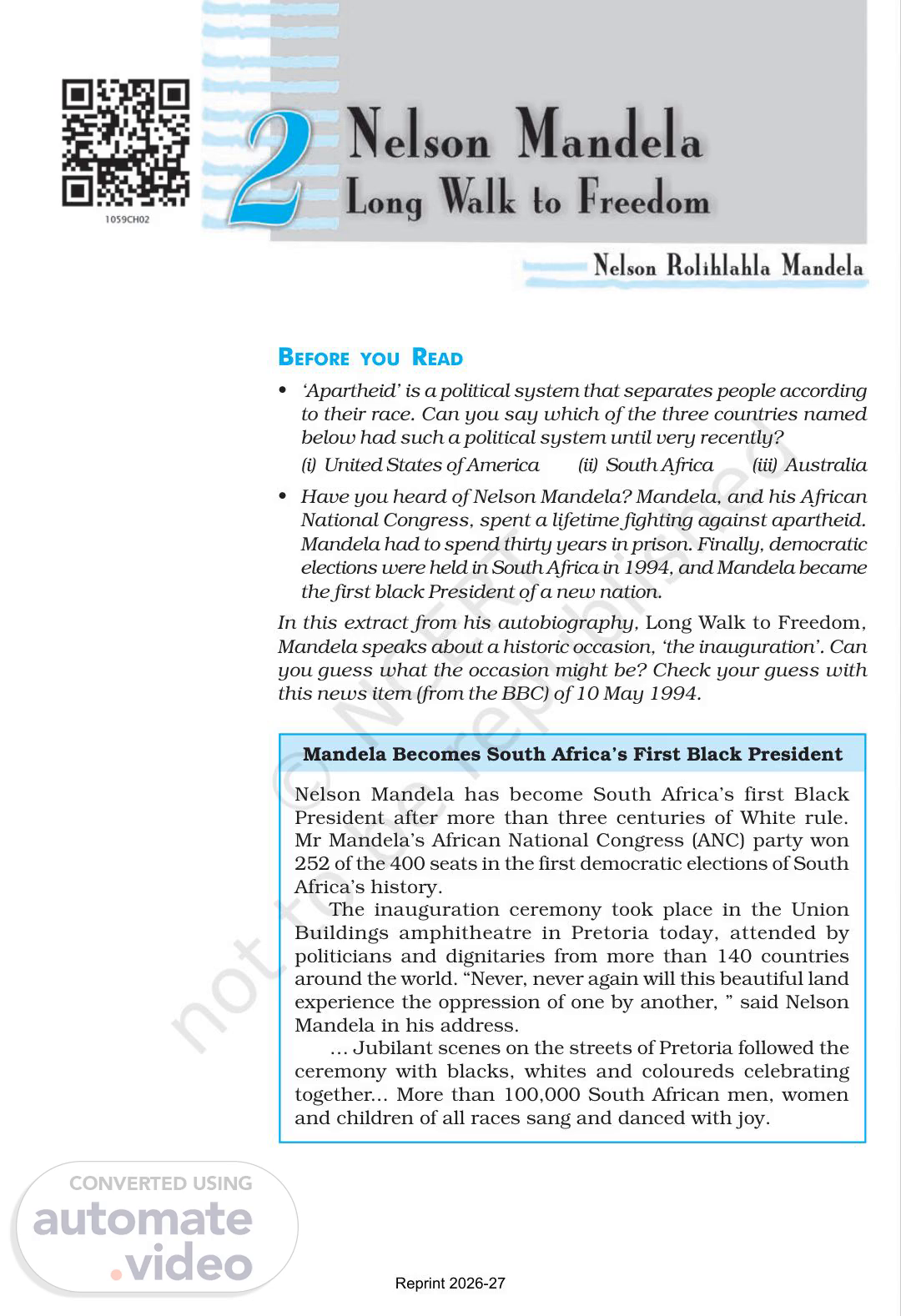 [Audio] resilience the ability to deal with any kind of hardship and recover from its effects 21 pushed to our limits pushed to the last point in our ability to bear pain courage, wisdom and generosity that their like may never be known again. Perhaps it requires such depths of oppression to create such heights of character. My country is rich in the minerals and gems that lie beneath its soil, but I have always known that its greatest wealth is its people, finer and truer than the purest diamonds. It is from these comrades in the struggle that I learned the meaning of courage. Time and again, I have seen men and women risk and give their lives for an idea. I have seen men stand up to attacks and torture without breaking, showing a strength and resilience that defies the imagination. I learned that courage was not the absence of fear, but the triumph over it. The brave man is not he who does not feel afraid, but he who conquers that fear. No one is born hating another person because of the colour of his skin, or his background, or his religion. People must learn to hate, and if they can learn to hate, they can be taught to love, for love comes more naturally to the human heart than its opposite. Even in the grimmest times in prison, when my comrades and I were pushed to our limits, I would see a glimmer of humanity in one of the guards, perhaps just for a second, but it was enough to reassure me and keep me going. Man's goodness is a flame that can be hidden but never extinguished. Oral Comprehension Check 1. What do the military generals do? How has their attitude changed, and why? 2. Why were two national anthems sung? 3. How does Mandela describe the systems of government in his country (i) in the first decade, and (ii) in the final decade, of the twentieth century? 4. What does courage mean to Mandela? 5. Which does he think is natural, to love or to hate? Nelson Mandela: Long Walk to Freedom In life, every man has twin obligations — obligations to his family, to his parents, to his wife and children; and he has an obligation to his people, his community, his country. In a civil and humane Reprint 2026-27.