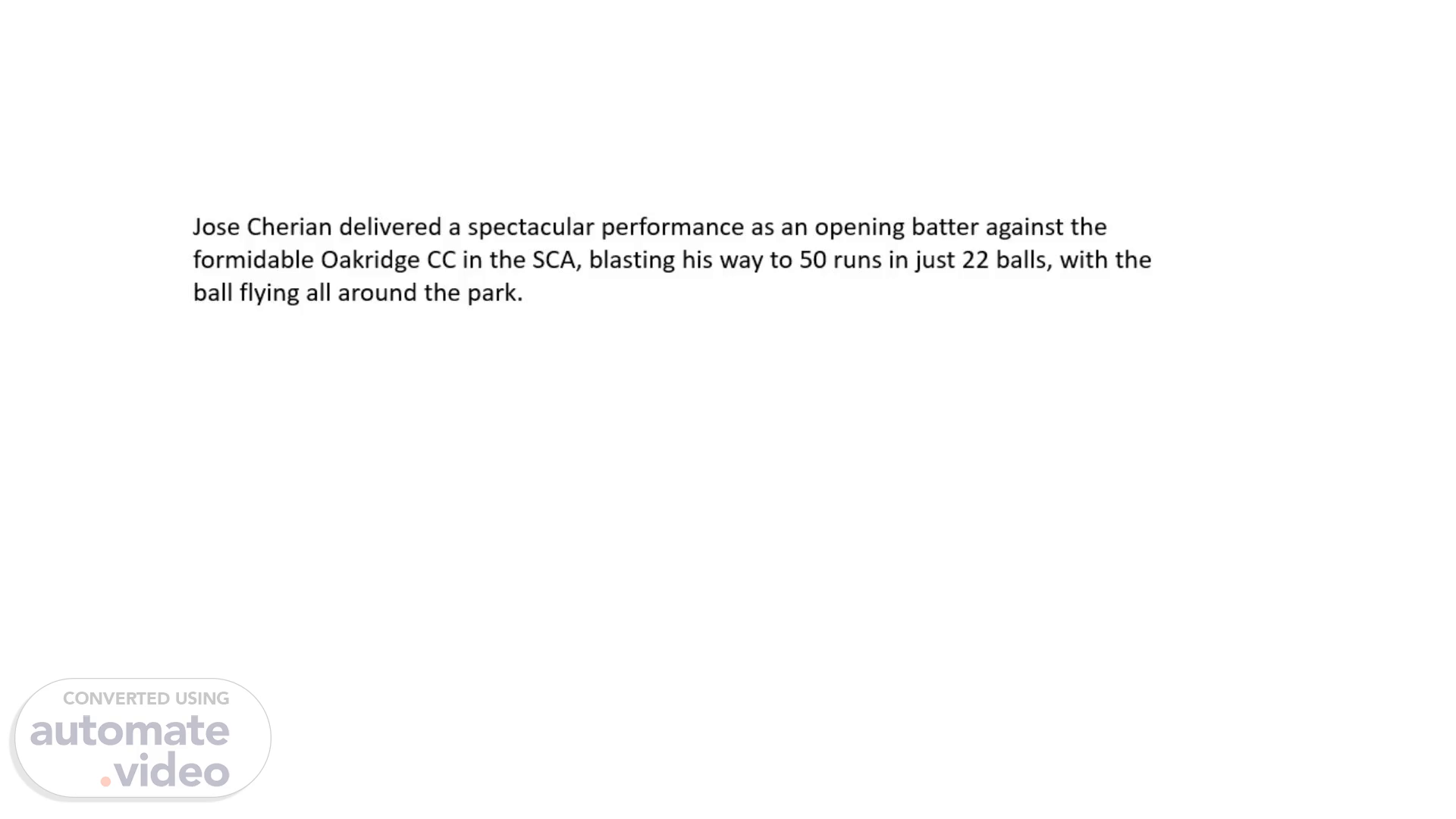 [Audio] Jose Cherian delivered a spectacular performance as an opening batter against the formidable Oakridge CC in the SCA, blasting his way to 50 runs in just 22 balls, with the ball flying all around the park..