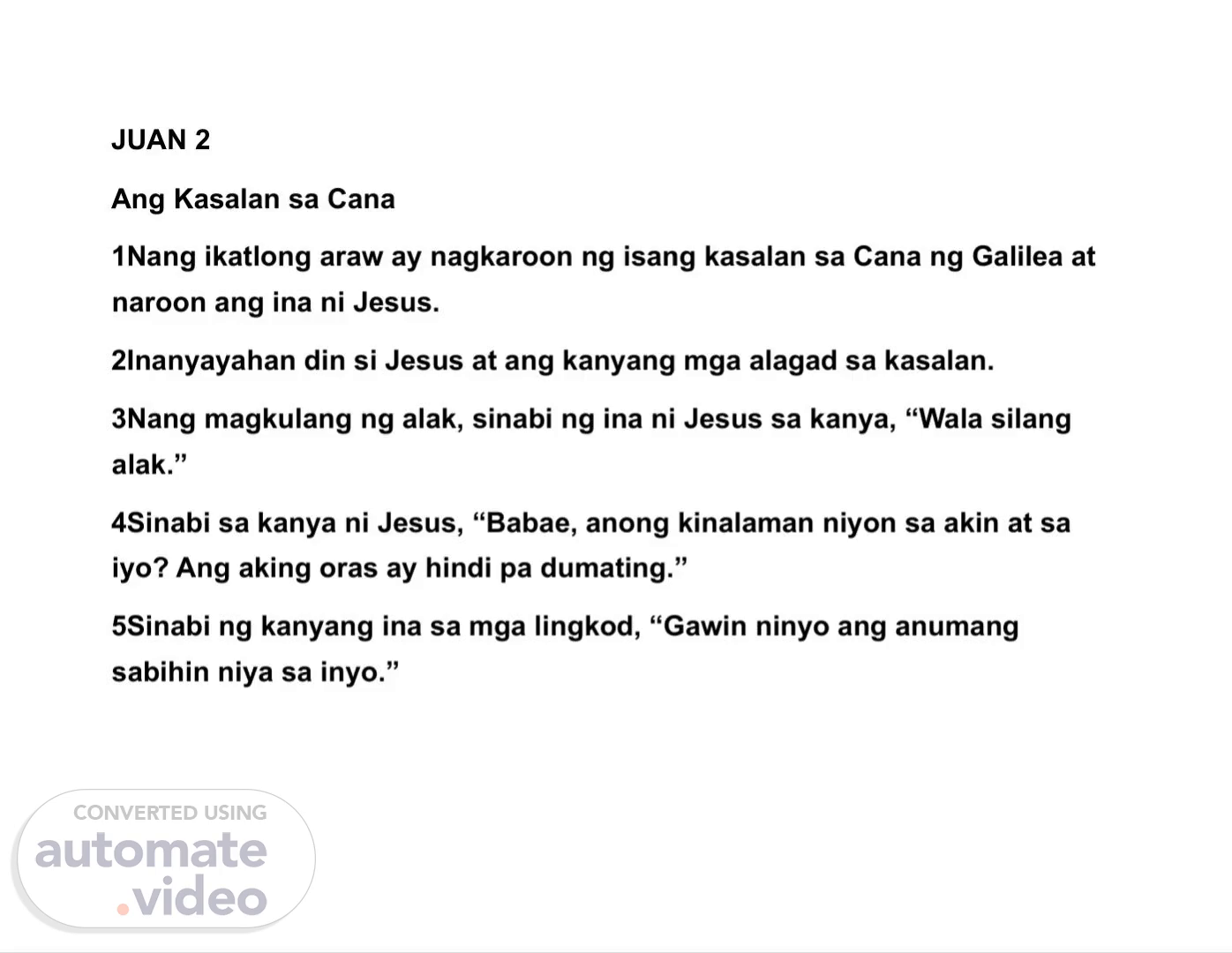 [Audio] JUAN 2 Ang Kasalan sa Cana 1Nang ikatlong araw ay nagkaroon ng isang kasalan sa Cana ng Galilea at naroon ang ina ni Jesus. 2Inanyayahan din si Jesus at ang kanyang mga alagad sa kasalan. 3Nang magkulang ng alak, sinabi ng ina ni Jesus sa kanya, "Wala silang alak." 4Sinabi sa kanya ni Jesus, "Babae, anong kinalaman niyon sa akin at sa iyo? Ang aking oras ay hindi pa dumating." 5Sinabi ng kanyang ina sa mga lingkod, "Gawin ninyo ang anumang sabihin niya sa inyo.".
