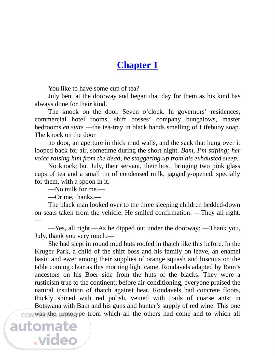 Chapter 1 You like to have some cup of tea?— July bent at the doorway and began that day for them as his kind has always done for their kind. The knock on the door. Seven o’clock. In governors’ residences, commercial hotel rooms, shift bosses’ company bungalows, master bedrooms en suite —the tea-tray in black hands smelling of Lifebuoy soap. The knock on the door no door, an aperture in thick mud walls, and the sack that hung over it looped back for air, sometime during the short night. Bam, I’m stifling; her voice raising him from the dead, he staggering up from his exhausted sleep. No knock; but July, their servant, their host, bringing two pink glass cups of tea and a small tin of condensed milk, jaggedly-opened, specially for them, with a spoon in it. —No milk for me.— —Or me, thanks.— The black man looked over to the three sleeping children bedded-down on seats taken from the vehicle. He smiled confirmation: —They all right. — —Yes, all right.—As he dipped out under the doorway: —Thank you, July, thank you very much.— She had slept in round mud huts roofed in thatch like this before. In the Kruger Park, a child of the shift boss and his family on leave, an enamel basin and ewer among their supplies of orange squash and biscuits on the table coming clear as this morning light came. Rondavels adapted by Bam’s ancestors on his Boer side from the huts of the blacks. They were a rusticism true to the continent; before air-conditioning, everyone praised the natural insulation of thatch against heat. Rondavels had concrete floors, thickly shined with red polish, veined with trails of coarse ants; in Botswana with Bam and his guns and hunter’s supply of red wine. This one was the prototype from which all the others had come and to which all.