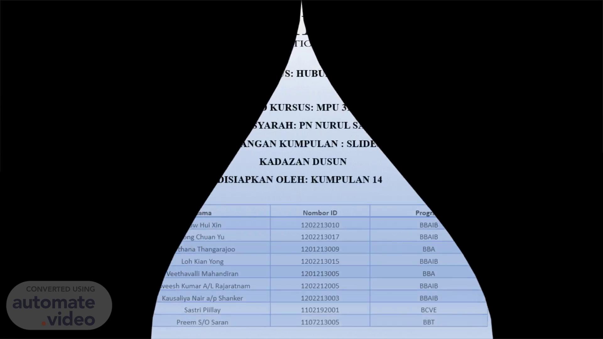 Nama Nombor ID Program Siow Hui Xin 1202213010 BBAIB Jong Chuan Yu 1202213017 BBAIB Kirthana Thangarajoo 1201213009 BBA Loh Kian Yong 1202213015 BBAIB Veethavalli Mahandiran 1201213005 BBA Kaveesh Kumar A/L Rajaratnam 1202212005 BBAIB Kausaliya Nair a/p Shanker 1202213003 BBAIB Sastri Piillay 1102192001 BCVE Preem S/O Saran 1107213005 BBT.