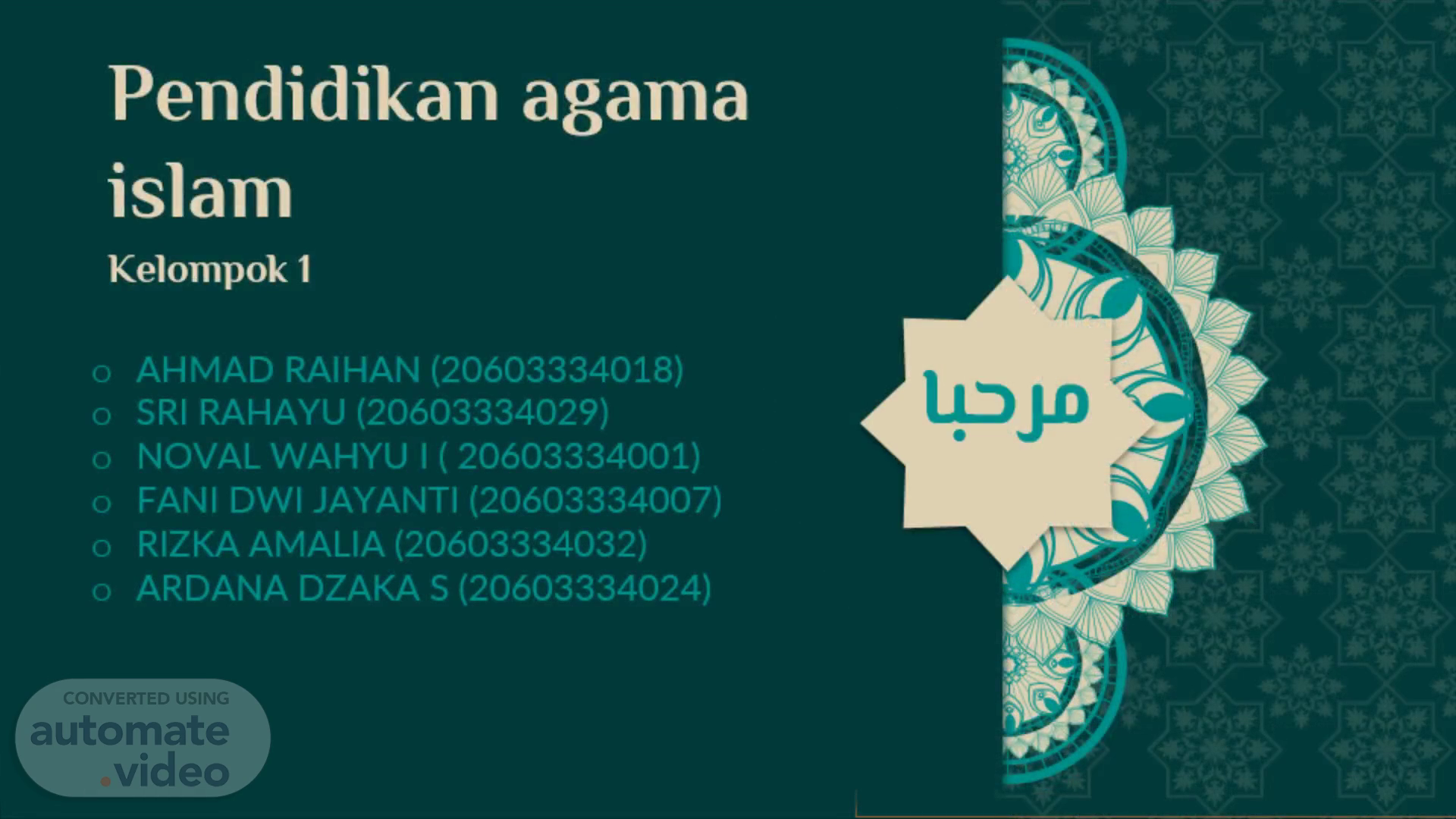 Pendidikan agama islam Kelompok 1. مرحبا. AHMAD RAIHAN (20603334018) SRI RAHAYU (20603334029) NOVAL WAHYU I ( 20603334001) FANI DWI JAYANTI (20603334007) RIZKA AMALIA (20603334032) ARDANA DZAKA S (20603334024).