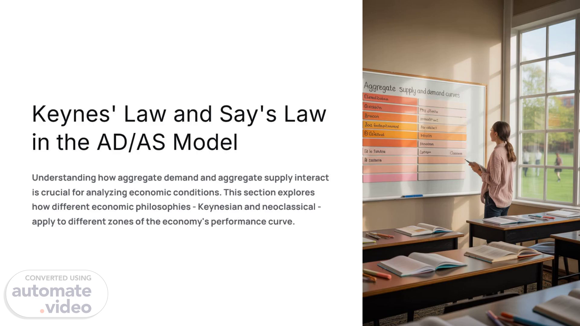 [Audio] Alright, buckle up, future economic gurus! We're diving into some foundational stuff here: Keynes' Law and Say's Law. These aren't just fancy names; they're two competing ideas about what really drives an economy, and they come alive when we look at our trusty Aggregate Demand/Aggregate Supply (AD/AS) model. First up, old-school Say's Law. It basically says, 'Supply creates its own demand.' Sounds lovely, right? Like if you make it, they will come! This idea usually holds true when an economy is humming along, almost at full capacity, with everyone employed and factories churning. In our AD/AS world, think of the steep, almost vertical part of the Aggregate Supply curve. If we're already producing everything we can, more demand just means higher prices, not more stuff. So, in this 'paradise of full employment,' supply is indeed the big boss. But then, along came Keynes, who looked at things like the Great Depression and said, 'Hold on a minute, Say. My eyes tell a different story.' Keynes' Law flips it: 'Demand creates its own supply.' If folks aren't buying, businesses aren't going to magically produce more just because they can. Why would they? They'd just end up with warehouses full of unsold widgets and a lot of very bored, unemployed people. This is for when the economy is in a slump, like the flatter, horizontal section of our AD/AS curve. Here, if demand picks up, businesses happily produce more to meet it. So, these two laws aren't mutually exclusive; they just describe different realities depending on where the economy is operating on its AS curve. Pretty neat, huh?.