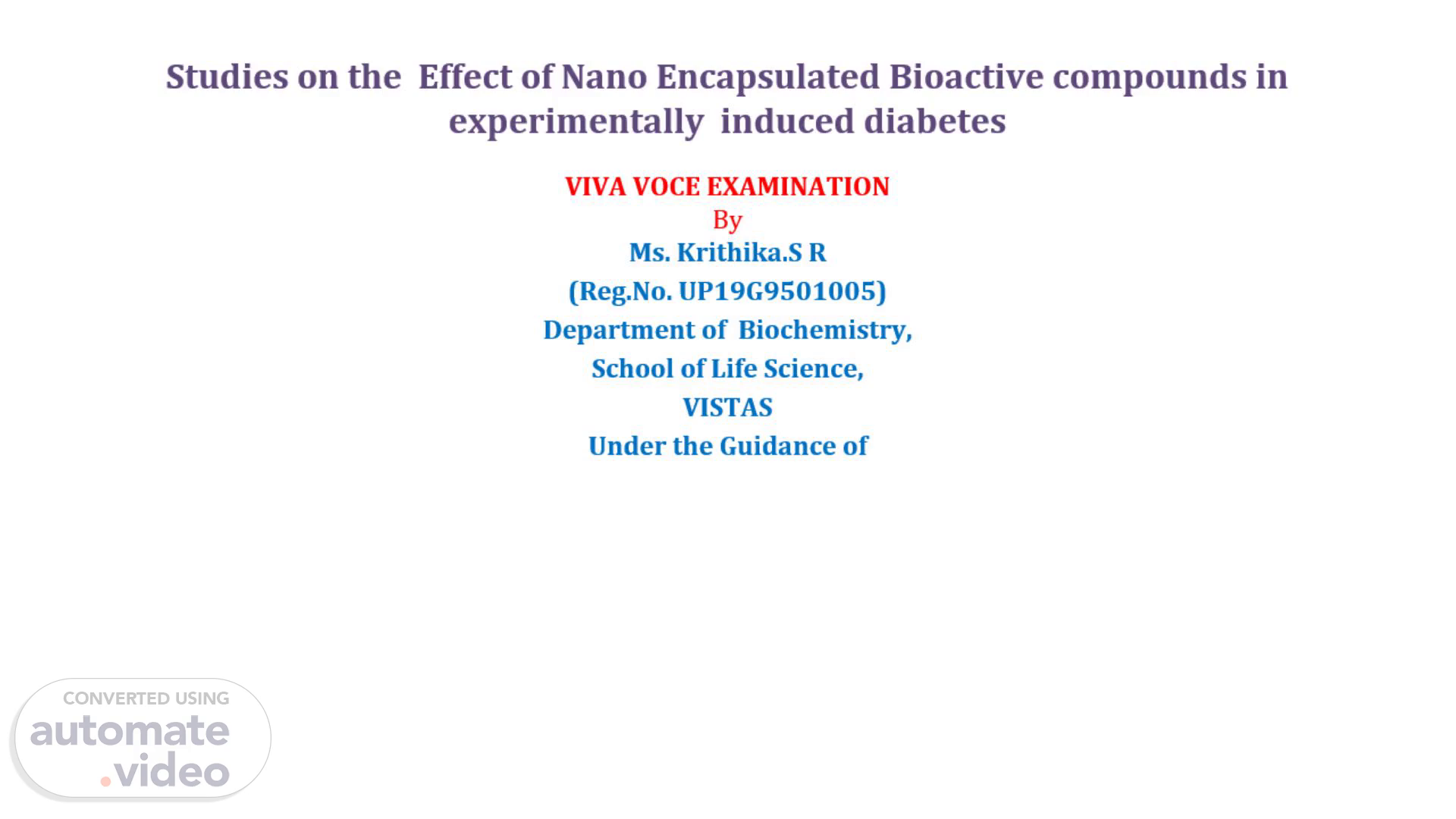 [Audio] The viva voce examination was conducted by Ms. Krithika S R under the guidance of Dr. Padmini R, an associate professor in the department of biochemistry, school of life sciences, VISTAS. The research examined the impact of nano-encapsulated bioactive compounds on experimentally induced diabetes..