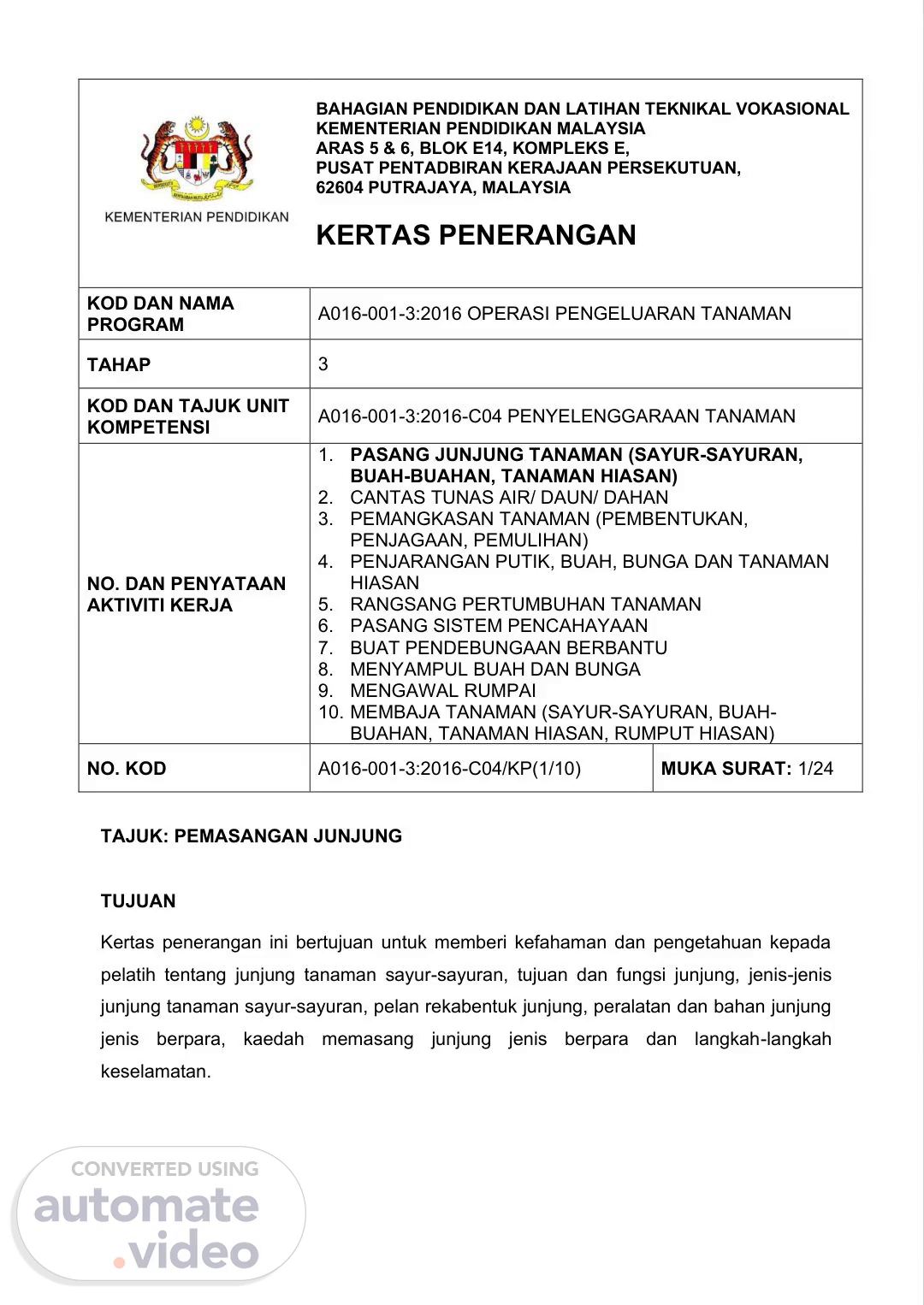[Audio] Bahagian Pendidikan Dan Latihan Teknikal Vokasional Kementerian Pendidikan Malaysia Aras 5 & 6, Blok E-1-4--, Kompleks E, Pusat Pentadbiran Kerajaan Persekutuan, 62604 Putrajaya, Malaysia Kertas Penerangan Kod Dan Nama Program A016-001-3:2016 Operasi Pengeluaran Tanaman Tahap 3 Kod Dan Tajuk Unit Kompetensi A016-001-3:2016-c04 Penyelenggaraan Tanaman No. Dan Penyataan Aktiviti Kerja 1. Pasang Junjung Tanaman (sayur sayuran, Buah buahan, Tanaman Hiasan) 2. Cantas Tunas Air/ Daun/ Dahan 3. Pemangkasan Tanaman (pembentukan, Penjagaan, Pemulihan) 4. Penjarangan Putik, Buah, Bunga Dan Tanaman Hiasan 5. Rangsang Pertumbuhan Tanaman 6. Pasang Sistem Pencahayaan 7. Buat Pendebungaan Berbantu 8. Menyampul Buah Dan Bunga 9. Mengawal Rumpai 10. Membaja Tanaman (sayur sayuran, Buahbuahan, Tanaman Hiasan, Rumput Hiasan) No. Kod A016-001-3:2016-C04/KP(1/10) Muka Surat: 1/24 Tajuk: Pemasangan Junjung Tujuan Kertas penerangan ini bertujuan untuk memberi kefahaman dan pengetahuan kepada pelatih tentang junjung tanaman sayur sayuran, tujuan dan fungsi junjung, jenis jenis junjung tanaman sayur sayuran, pelan rekabentuk junjung, peralatan dan bahan junjung jenis berpara, kaedah memasang junjung jenis berpara dan langkah langkah keselamatan..