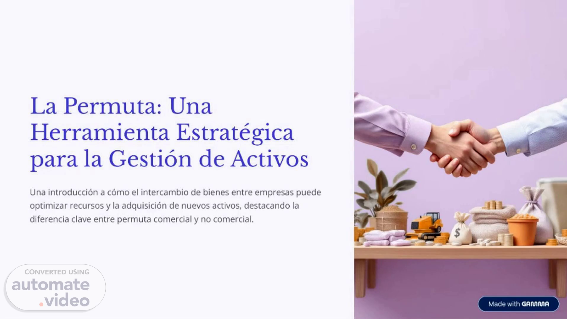 [Audio] La permuta es una estrategia utilizada en la gestión de activos que permite intercambiar bienes con otras empresas para optimizar recursos y adquirir nuevos activos. En esta presentación, se ha discutido la diferencia entre la permuta comercial y la permuta no comercial. En este último caso, es importante enfatizar que la permuta es una herramienta poderosa y estratégica para el intercambio de bienes. La permuta es un contrato versátil que permite un intercambio inteligente de bienes y servicios. Su correcta clasificación y registro son fundamentales para optimizar la gestión de activos y las operaciones empresariales. Ofrece beneficios tanto en el aspecto financiero como en el comercial, y su versatilidad la convierte en una herramienta adaptable para el intercambio de bienes y servicios. La contabilización adecuada juega un papel clave en la permuta, ya que la diferenciación entre una permuta comercial y no comercial es esencial para tener registros precisos. En una permuta comercial, el activo recibido se valora a su valor justo, mientras que en una permuta no comercial se valora por el valor contable neto del bien entregado. Es fundamental tener una valoración precisa en ambos tipos de permutas. Además, la permuta ofrece beneficios estratégicos al mejorar la gestión de activos, la liquidez y las relaciones comerciales. Es esencial comprender plenamente la permuta para aprovechar al máximo sus ventajas y optimizar las operaciones empresariales. Con esta herramienta, podemos mejorar la gestión de activos y fortalecer nuestras relaciones comerciales. En resumen, la permuta es una herramienta inteligente y estratégica que permite el intercambio de bienes con otras empresas. Su correcta clasificación y registro son vitales para su éxito, ya que ofrece beneficios tanto en el aspecto financiero como en el comercial. Es importante comprender a fondo la permuta para aprovechar al máximo sus ventajas. Gracias por su atención..
