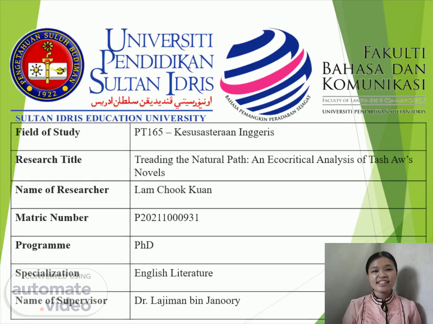 mvcl vsw•n Q7ns. Field of Study PT165 – Kesusasteraan Inggeris Research Title Treading the Natural Path: An Ecocritical Analysis of Tash Aw’s Novels Name of Researcher Lam Chook Kuan Matric Number P20211000931 Programme PhD Specialization English Literature Name of Supervisor Dr. Lajiman bin Janoory.