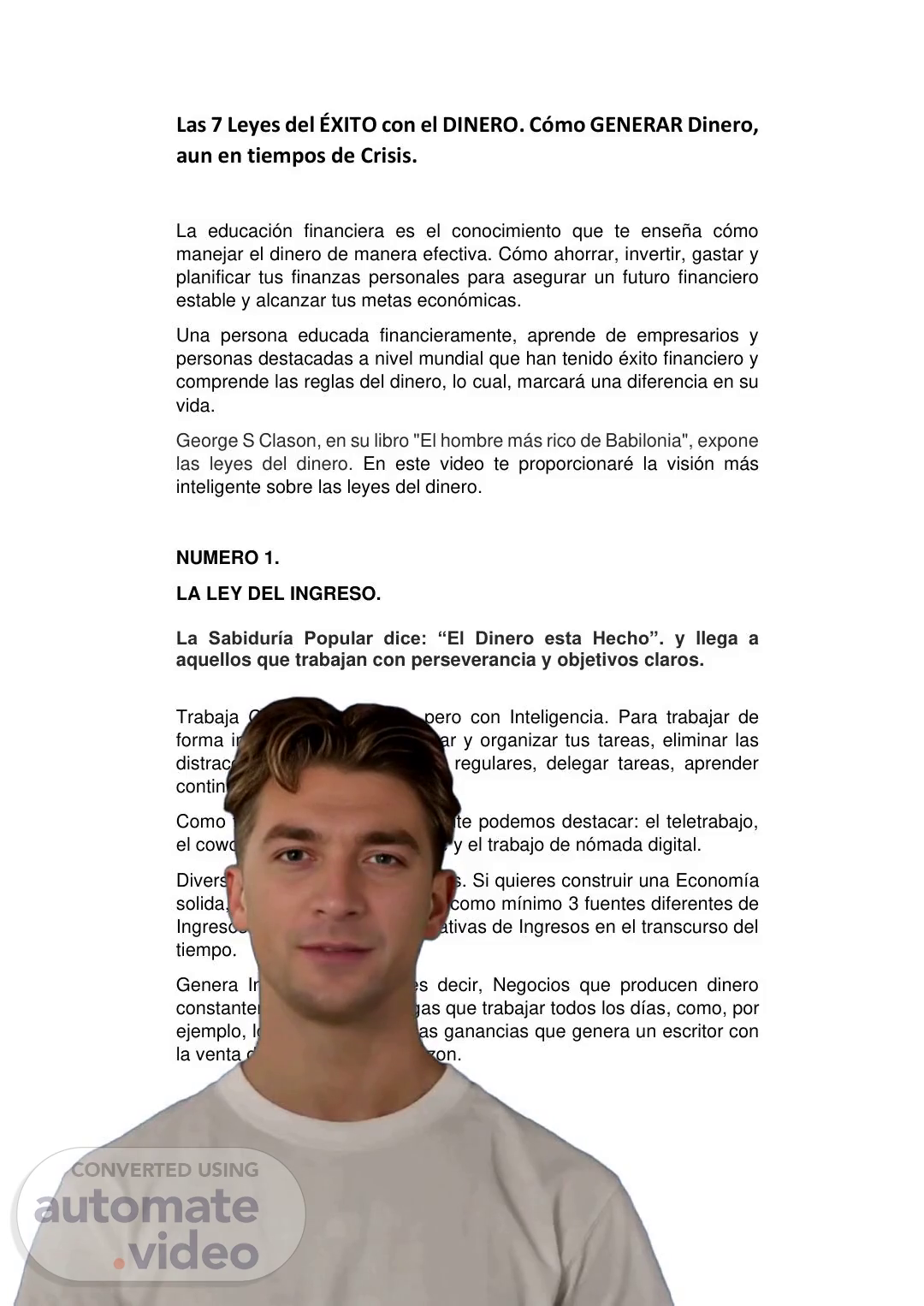 [Virtual Presenter] Sabemos bien que la educación financiera es un tema fundamental para una estabilidad económica futura. Es el conocimiento que nos ayuda a manejar el dinero de forma eficaz ahorrar invertir gastar y planificar nuestras finanzas de forma adecuada. Al educarnos financieramente aprendemos de aquellos que han tenido éxito y entendemos las reglas y principios que nos ayudan a alcanzar nuestras metas. George S Clason lo expresó en su libro "El hombre más rico de Babilonia" al exponer las leyes del dinero. Por ello en esta presentación le ofreceremos el conocimiento para lograr el éxito financiero comenzando por la primera ley: la ley del ingreso. La sabiduría popular ya dice “el dinero esta hecho” para aquellos que trabajan con perseverancia y objetivos claros. Trabajar inteligente requiere planificar organizar eliminar distracciones tomar descansos regulares delegar tareas aprender en todo momento y cuidar nuestra salud. Diversificar nuestras fuentes de ingresos y generar ingresos pasivos ayuda a construir una economía sólida..