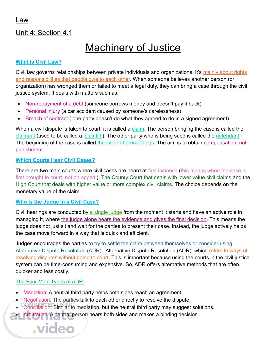 [Audio] Welcome to Unit 4, Section 4.1 of our presentation on the Machinery of Justice. In today's session, we will be discussing the concept of Civil Law. This type of law deals with resolving conflicts between individuals and organizations. It governs the rights and obligations of these parties towards each other. When one party believes they have been wronged or the other party has failed to fulfill a legal duty, they can pursue a case through the civil justice system. These cases are heard in either the County Court or the High Court, where a single judge actively manages the case and encourages alternative methods of resolving the dispute to avoid the time and expenses of going to court. Civil Law covers a wide range of matters, including debt repayment, personal injuries, and breach of contract. When a civil dispute is brought to court, it is called a claim, with the person initiating the case known as the claimant, and the party being sued known as the defendant. The beginning of a civil case is referred to as the issue of proceedings. The goal of a civil case is to obtain compensation, rather than punishment. The two main courts for hearing civil cases are the County Court, which handles lower value claims, and the High Court, which deals with higher value or more complex claims. The choice of court depends on the monetary value of the claim. Civil hearings are presided over by a single judge, who actively manages the case and makes the final decision based on the evidence presented. This concludes our overview of Civil Law. We hope this has provided a basic understanding of this important area of law. Stay tuned for the remaining sections of our presentation, where we will delve deeper into the machinery of justice..