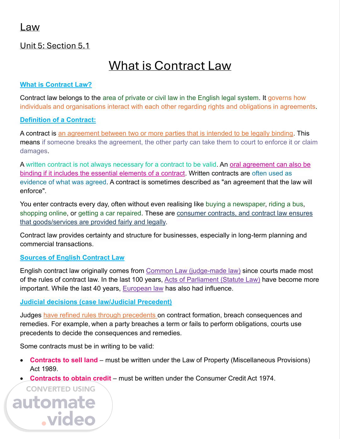 Law Unit 5: Section 5.1 What is Contract Law What is Contract Law? Contract law belongs to the area of private or civil law in the English legal system. It governs how individuals and organisations interact with each other regarding rights and obligations in agreements. Definition of a Contract: A contract is an agreement between two or more parties that is intended to be legally binding. This means if someone breaks the agreement, the other party can take them to court to enforce it or claim damages. A written contract is not always necessary for a contract to be valid. An oral agreement can also be binding if it includes the essential elements of a contract. Written contracts are often used as evidence of what was agreed. A contract is sometimes described as "an agreement that the law will enforce". You enter contracts every day, often without even realising like buying a newspaper, riding a bus, shopping online, or getting a car repaired. These are consumer contracts, and contract law ensures that goods/services are provided fairly and legally. Contract law provides certainty and structure for businesses, especially in long-term planning and commercial transactions. Sources of English Contract Law English contract law originally comes from Common Law (judge-made law) since courts made most of the rules of contract law. In the last 100 years, Acts of Parliament (Statute Law) have become more important. While the last 40 years, European law has also had influence. Judicial decisions (case law/Judicial Precedent) Judges have refined rules through precedents on contract formation, breach consequences and remedies. For example, when a party breaches a term or fails to perform obligations, courts use precedents to decide the consequences and remedies. Some contracts must be in writing to be valid: • Contracts to sell land – must be written under the Law of Property (Miscellaneous Provisions) Act 1989. • Contracts to obtain credit – must be written under the Consumer Credit Act 1974..