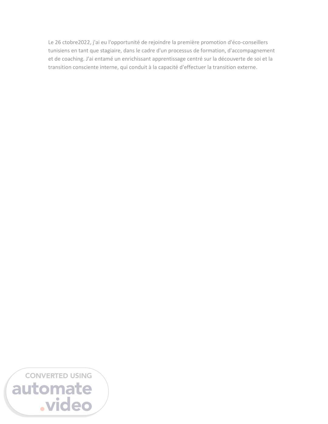 [Audio] D'abord, je tiens à remercier l'audience de m'avoir laissé présenter cela. Ensuite, je souhaite discuter de la sixième partie de la présentation, où la thématique environnementale est renforcée par un stage pratique effectué en Belgique. Ce stage a été un moment clé pour les éco-conseillers tunisiens, chargés de promouvoir de nouveaux concepts et de soutenir le changement. Les compétences acquises lors de cette expérience leur ont donné plus de confiance en eux-mêmes, ont facilité la communication et l'interaction, ont affûté leur maîtrise des outils de recherche, de communication, de gestion, de formulation, d'évaluation et de critique. Assumer les six rôles de l'éco-conseiller représente un défi complexe et requis. Cependant, les Tunisiens ont montré qu'ils étaient à la hauteur de la tâche en mettant en œuvre des initiatives telles que le Café Zéro Déchets. Enfin, je voudrais souligner que la plus grande responsabilité des éco-conseillers est de créer un monde meilleur pour toutes les générations présentes et futures. Je vous remercie à nouveau pour votre attention..