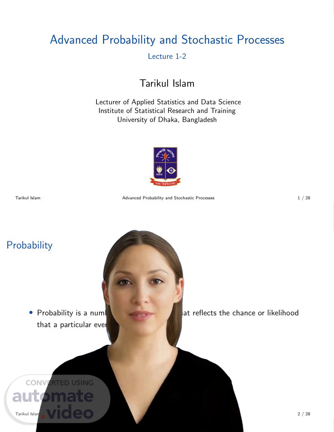 [Virtual Presenter] Probability is a numerical value that represents the likelihood of occurrence of an event. This value lies between 0 and 1. A probability of 0 means the event cannot happen, while a probability of 1 indicates the event will definitely occur. Probabilities can be calculated using various methods such as counting methods, experimental methods, and theoretical methods. Understanding probabilities is essential in many fields including statistics, engineering, economics, and finance..