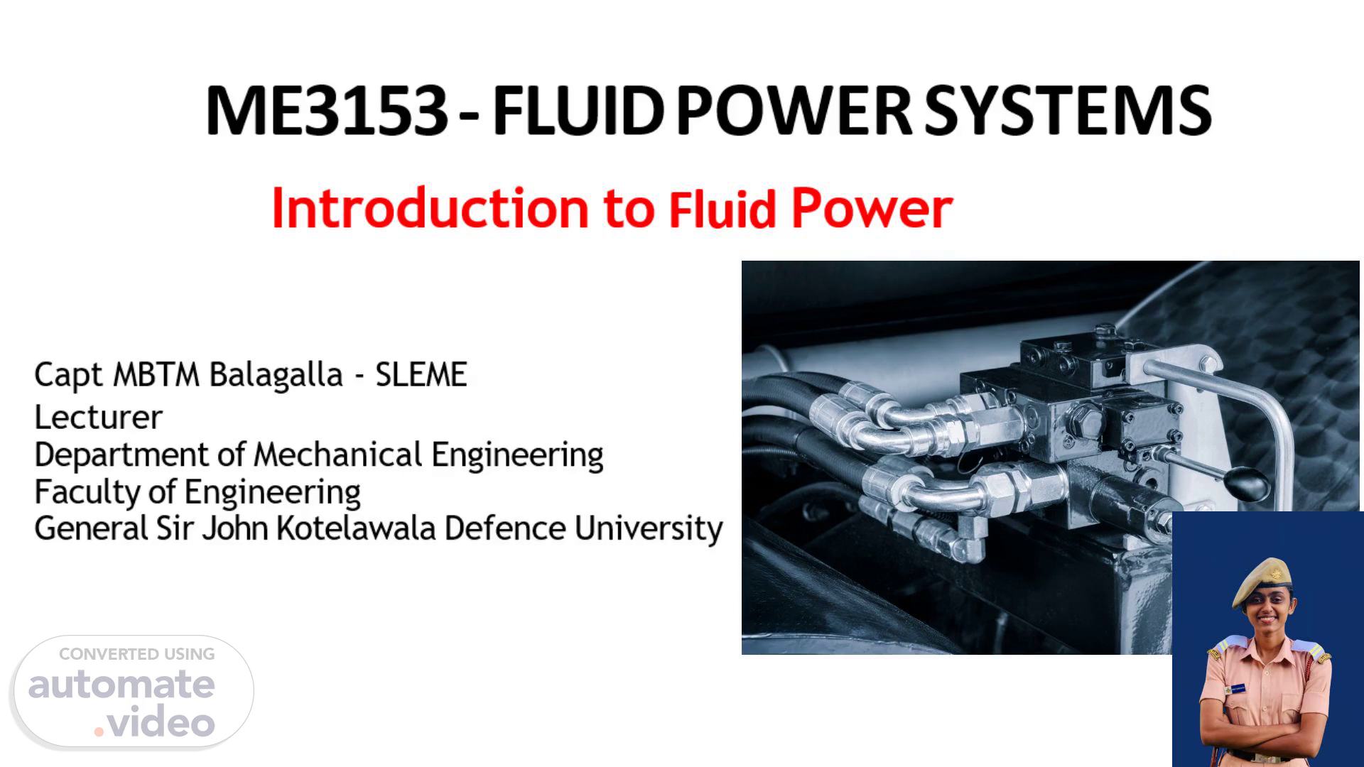 [Audio] The speaker has provided a comprehensive overview of fluid power systems, covering various aspects including design, operation, and application. The presentation has highlighted the importance of fluid power in modern industries, particularly in manufacturing, healthcare, and transportation. The speaker has also emphasized the need for fluid power systems to be designed with safety and efficiency in mind. The key takeaways from the presentation are: 1. Fluid power systems can be used in a wide range of applications, including industrial processes, medical equipment, and consumer goods. 2. The choice of fluid power system depends on the specific requirements of each application, taking into account factors such as pressure, flow rate, and temperature. 3. Safety features should be incorporated into fluid power systems to prevent accidents and injuries. 4. Energy efficiency is crucial in fluid power systems, as it can significantly reduce operating costs and minimize environmental impact. The speaker has also discussed the importance of selecting the right fluid power components, such as pumps, valves, and cylinders, to ensure optimal performance and reliability. The speaker has highlighted the benefits of using advanced technologies, such as hydraulic and pneumatic systems, to improve efficiency and productivity. The speaker has also emphasized the need for regular maintenance and inspection of fluid power systems to prevent failures and ensure safe operation..