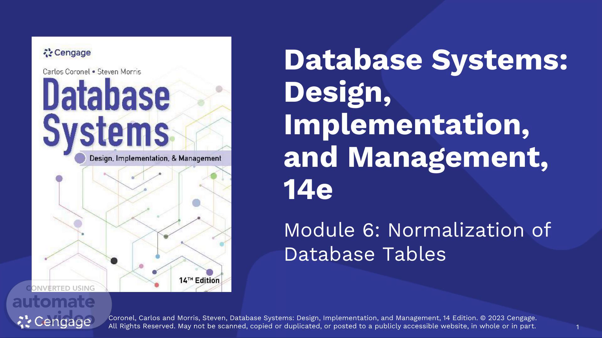 Coronel, Carlos and Morris, Steven, Database Systems: Design, Implementation, and Management, 14 Edition. © 2023 Cengage. All Rights Reserved. May not be scanned, copied or duplicated, or posted to a publicly accessible website, in whole or in part. 1 1 Database Systems: Design, Implementation, and Management, 14e Module 6: Normalization of Database Tables Coronel, Carlos and Morris, Steven, Database Systems: Design, Implementation, and Management, 14 Edition. © 2023 Cengage. All Rights Reserved. May not be scanned, copied or duplicated, or posted to a publicly accessible website, in whole or in part..
