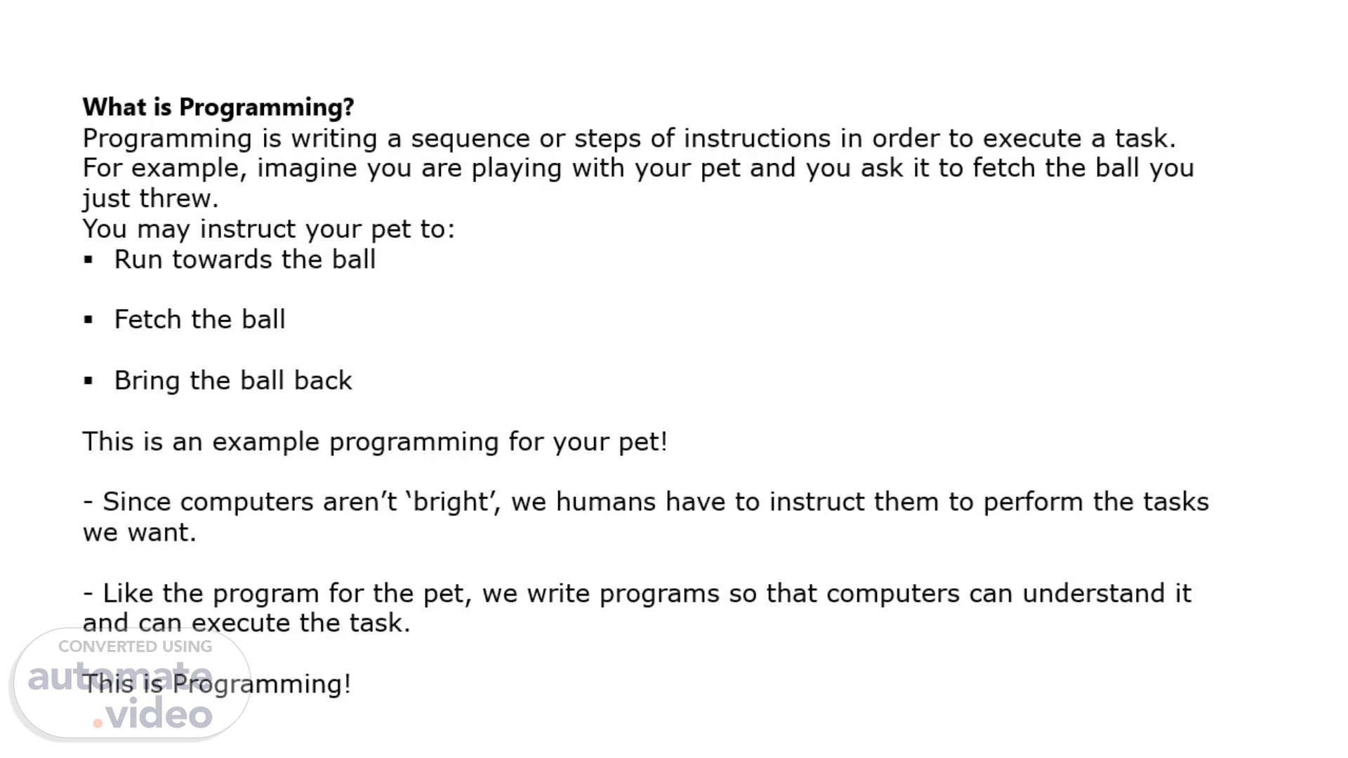 What is Programming? Programming is writing a sequence or steps of instructions in order to execute a task. For example, imagine you are playing with your pet and you ask it to fetch the ball you just threw. You may instruct your pet to: Run towards the ball Fetch the ball Bring the ball back This is an example programming for your pet! - Since computers aren’t ‘bright’, we humans have to instruct them to perform the tasks we want. - Like the program for the pet, we write programs so that computers can understand it and can execute the task. This is Programming!.