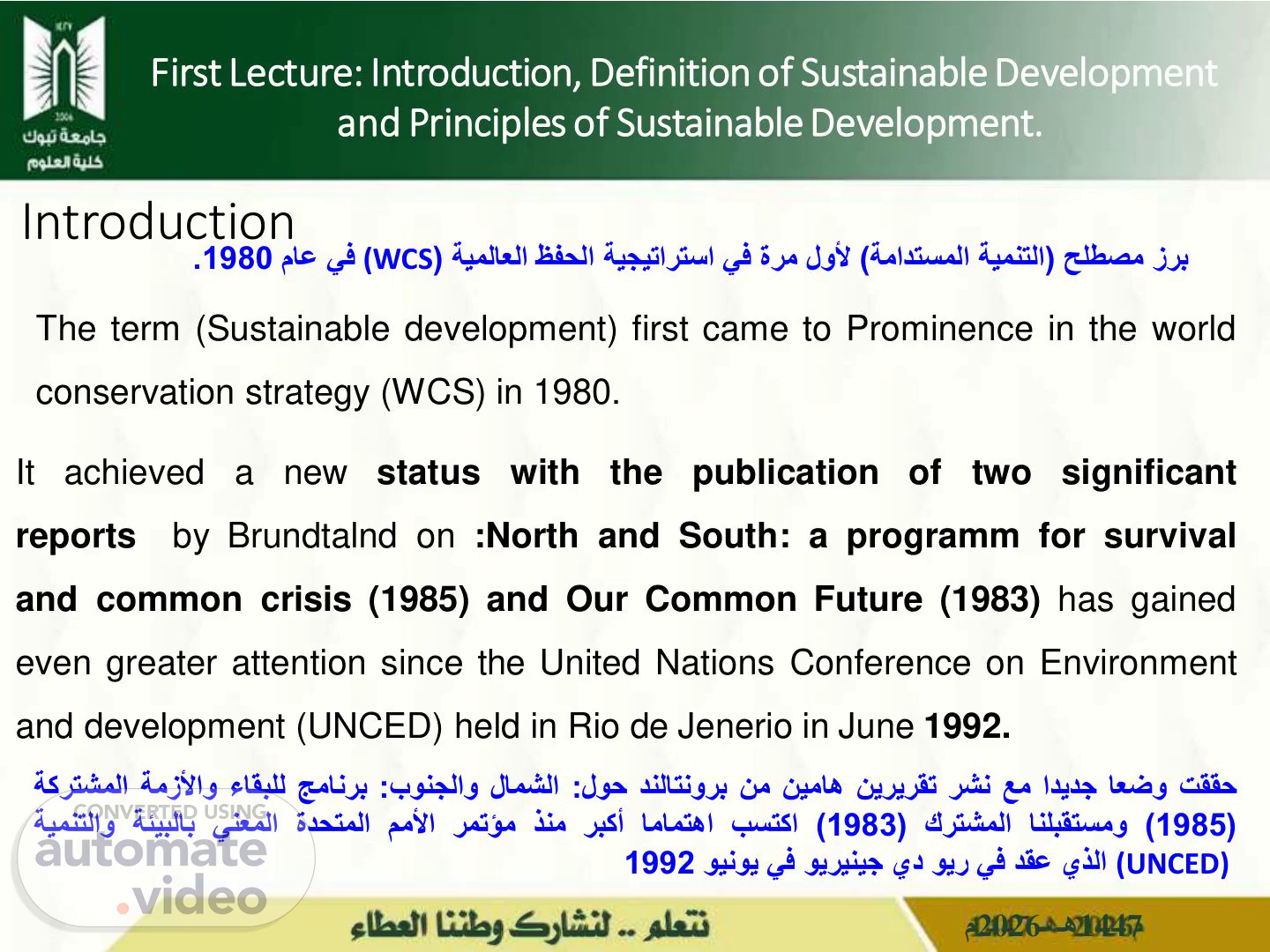 First Lecture: Introduction,Definitionof SustainableDevelopment and Principles of SustainableDevelopment. Introduction It achieved a new status with the publication of two significant reports by Brundtalnd on :North and South: a programm for survival and common crisis (1985) and Our Common Future (1983) has gained even greater attention since the United Nations Conference on Environment and development (UNCED) held in Rio de Jenerio in June 1992. تققحاعضواديدجعمرشننيريرقتنيماهنمدنلاتنوربلوح:لامشلابونجلاو:جمانربءاقبللةمزلأاوشملاةكرت (1985)انلبقتسموكرتشملا(1983)بستكاامامتهاربكأذنمرمتؤممملأاةدحتملاينعملاةئيبلابةيمنتلاو (UNCED)يذلادقعيفويريدويرينيجيفوينوي1992 حلطصم زرب(ةمادتسملا ةيمنتلا ) يف ةرم لولأةيجيتارتسا ةيملاعلا ظفحلا((WCS ماع يف1980. The term (Sustainable development) first came to Prominence in the world conservation strategy (WCS) in 1980. م2026- ـه1447.
