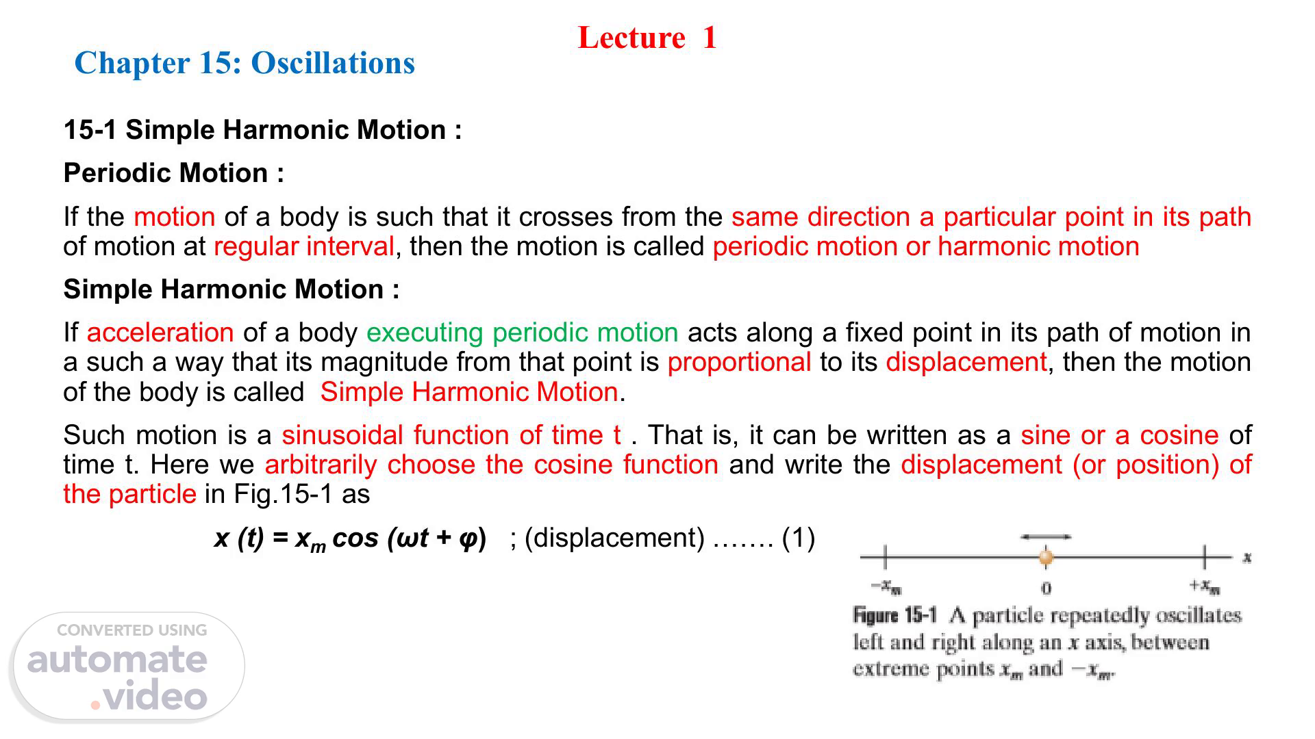 Lecture 1 15-1 Simple Harmonic Motion : Periodic Motion : If the motion of a body is such that it crosses from the same direction a particular point in its path of motion at regular interval, then the motion is called periodic motion or harmonic motion Simple Harmonic Motion : If acceleration of a body executing periodic motion acts along a fixed point in its path of motion in a such a way that its magnitude from that point is proportional to its displacement, then the motion of the body is called Simple Harmonic Motion. Such motion is a sinusoidal function of time t . That is, it can be written as a sine or a cosine of time t. Here we arbitrarily choose the cosine function and write the displacement (or position) of the particle in Fig.15-1 as x (t) = xm cos (ωt + φ) ; (displacement) ……. (1) Chapter 15: Oscillations.