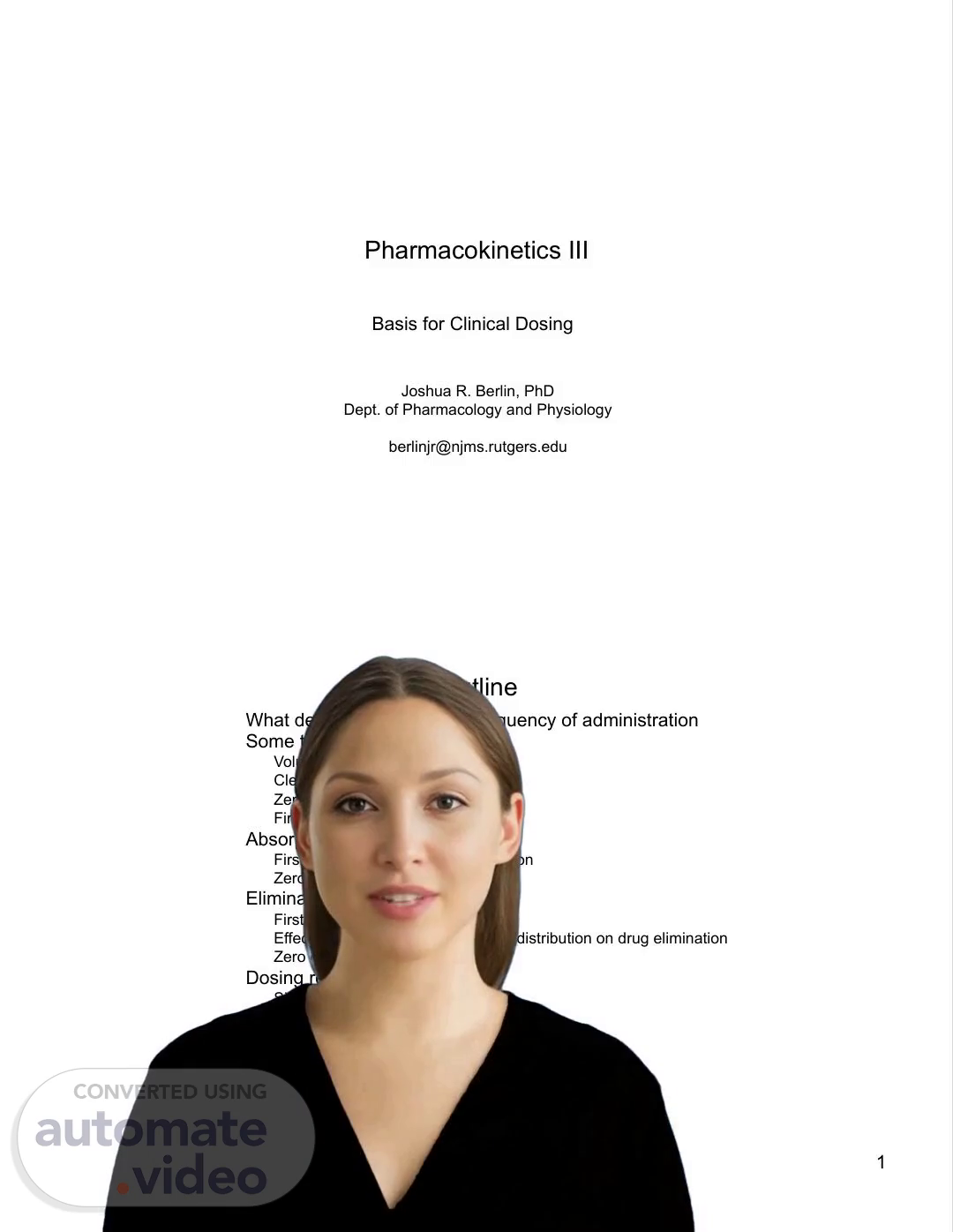 [Virtual Presenter] The concept of pharmacokinetics is essential for comprehending how medications interact with human physiology. Several key factors must be considered to establish an accurate dosage regimen. These factors include the volume of distribution, clearance, zero-order and first-order kinetics, absorption, and elimination. A thorough comprehension of these concepts enables the prediction of a medication's behavior within the body over time. The volume of distribution represents the theoretical volume in which a medication would be evenly distributed throughout the body. In contrast, clearance denotes the rate at which a medication is eliminated from the body. Zero-order kinetics describe scenarios where the elimination rate remains constant regardless of the medication's concentration, whereas first-order kinetics involve a direct correlation between the elimination rate and the medication's concentration. When a medication enters the bloodstream via the digestive system, absorption occurs. This process is explained by first-order and Fick's Law of diffusion. Elimination involves the removal of a medication from the body, either through metabolic processes or excretion. The impact of clearance and volume of distribution on drug elimination is pivotal in determining the optimal dosage and treatment schedule. Dosage regimens can vary significantly depending on whether a single dose or continuous administration is employed. Continuous administration typically entails administering a fixed amount of the medication over a predetermined period, whereas intermittent administration involves taking multiple doses spaced apart. Changes in dosing regimens may occur based on individual patient needs or response to therapy. A comprehensive understanding of pharmacokinetics allows healthcare professionals to more effectively manage and treat patients..