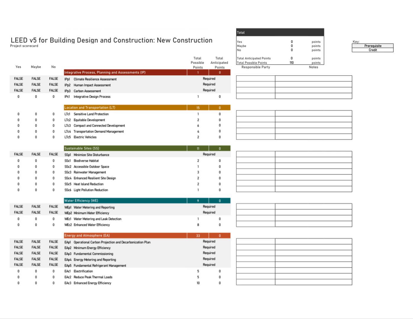 v5 BD+C NEW CONSTRUCTION SCORECARD Scene 1 Total possible points: 110 points. Integrative Process, Planning and Assessments — IP IP prerequisite 1: Climate Resilience Assessment. Required. IP prerequisite 2: Human Impact Assessment. Required. IP prerequisite 3: Carbon Assessment. Required. IP credit 1: Integrative Design Process. 1 possible point. 0 anticipated points. Location and Transportation — L T Total possible points: 15. Anticipated: 0. LT credit 1: Sensitive Land Protection. 1 point. LT credit 2: Equitable Development. 2 points. LT credit 3: Compact and Connected Development. 6 points. LT credit 4: Transportation Demand Management. 4 points. LT credit 5: Electric Vehicles. 2 points. Sustainable Sites — S S Total possible points: 11. Anticipated: 0. SS prerequisite 1: Minimize Site Disturbance. Required. SS credit 1: Biodiverse Habitat. 2 points. SS credit 2: Accessible Outdoor Space. 1 point. SS credit 3: Rainwater Management. 3 points. SS credit 4: Enhanced Resilient Site Design. 2 points. SS credit 5: Heat Island Reduction. 2 points. SS credit 6: Light Pollution Reduction. 1 point. Water Efficiency — W E Total possible points: 9. Anticipated: 0. WE prerequisite 1: Water Metering and Reporting. Required. WE prerequisite 2: Minimum Water Efficiency. Required. WE credit 1: Water Metering and Leak Detection. 1 point. WE credit 2: Enhanced Water Efficiency. 8 points. Energy and Atmosphere — E A Total possible points: 33. Anticipated: 0. EA prerequisite 1: Operational Carbon Projection and Decarbonization Plan. Required. EA prerequisite 2: Minimum Energy Efficiency. Required. EA prerequisite 3: Fundamental Commissioning. Required. EA prerequisite 4: Energy Metering and Reporting. Required. EA prerequisite 5: Fundamental Refrigerant Management. Required. EA credit 1: Electrification. 5 points. EA credit 2: Reduce Peak Thermal Loads. 5 points. EA credit 3: Enhanced Energy Efficiency. 10 points. Scene 2 EA credit 4: Renewable Energy. 5 points. EA credit 5: Enhanced Commissioning. 4 points. EA credit 6: Grid Interactive. 2 points. EA credit 7: Enhanced Refrigerant Management. 2 points. Materials and Resources — M R Total possible points: 18. Anticipated: 0. MR prerequisite 1: Planning for Zero Waste Operations. Required. MR prerequisite 2: Quantify and Assess Embodied Carbon. Required. MR credit 1: Building and Materials Reuse. 3 points. MR credit 2: Reduce Embodied Carbon. 6 points. MR credit 3: Low-Emitting Materials. 2 points. MR credit 4: Building Product Selection and Procurement. 5 points. MR credit 5: Construction and Demolition Waste Diversion. 2 points. Indoor Environmental Quality — E Q Total possible points: 13. Anticipated: 0. EQ prerequisite 1: Construction Management. Required. EQ prerequisite 2: Fundamental Air Quality. Required. EQ prerequisite 3: No Smoking or Vehicle Idling. Required. EQ credit 1: Enhanced Air Quality. 1 point. EQ credit 2: Occupant Experience. 7 points. EQ credit 3: Accessibility and Inclusion. 1 point. EQ credit 4: Resilient Spaces. 2 points. EQ credit 5: Air Quality Testing and Monitoring. 2 points. Project Priorities — P R Total possible points: 10. Anticipated: 0. PR credit 1: Project Priorities. 9 points. Project Priority 1: Insert credit name. Project Priority 2: Insert credit name. Project Priority 3: Insert credit name. Project Priority 4: Insert credit name. Project Priority 5: Insert credit name. Project Priority 6: Insert credit name. Project Priority 7: Insert credit name. Project Priority 8: Insert credit name. Project Priority 9: Insert credit name. PR credit 2: LEED AP. 1 point. Total possible points: 110.