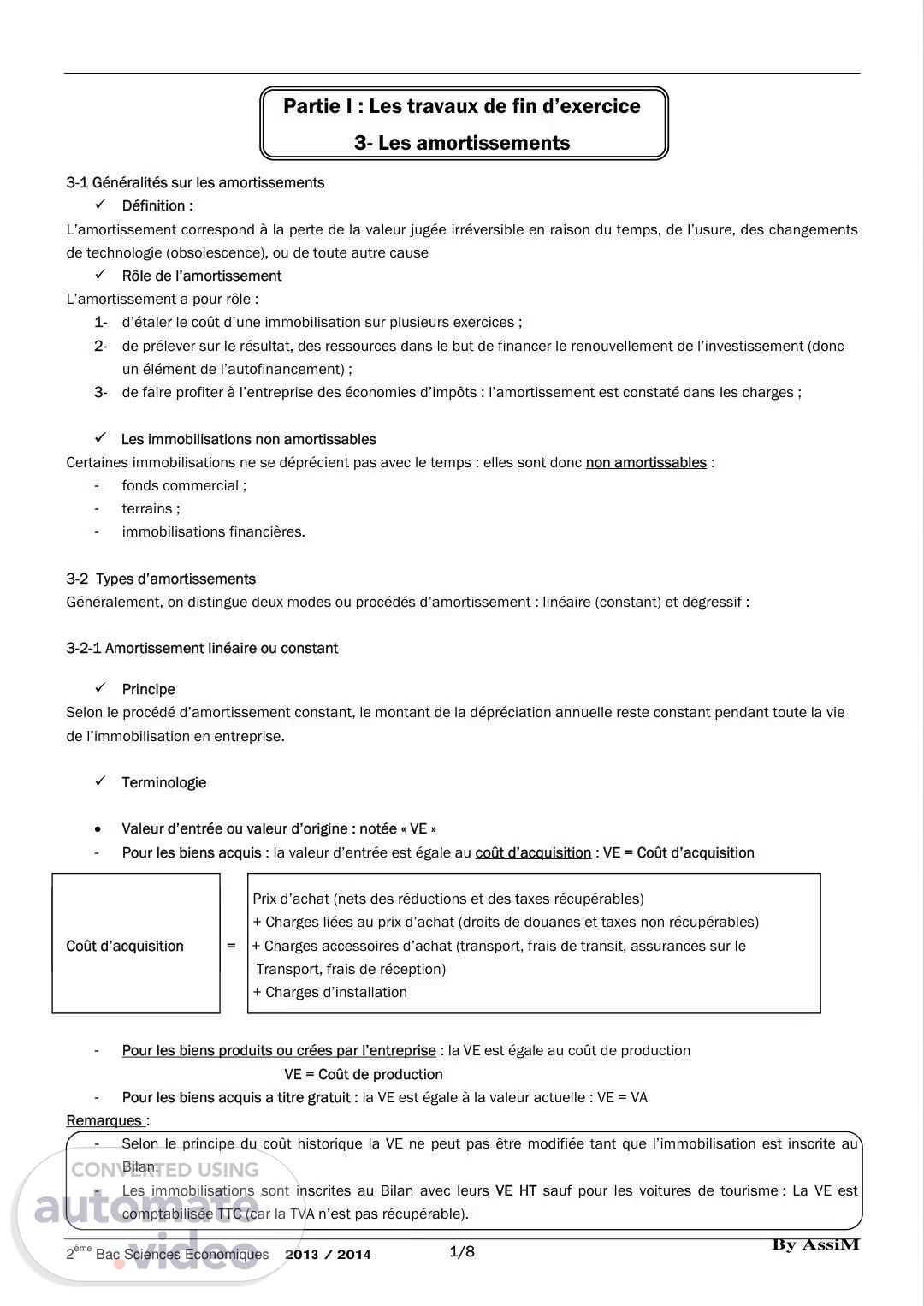 [Audio] Partie I : Les travaux de fin d'exercice 3- Les amortissements 3-1 Généralités sur les amortissements ü Définition : L'amortissement correspond à la perte de la valeur jugée irréversible en raison du temps, de l'usure, des changements de technologie (obsolescence), ou de toute autre cause ü Rôle de l'amortissement L'amortissement a pour rôle : 1- d'étaler le coût d'une immobilisation sur plusieurs exercices ; 2- de prélever sur le résultat, des ressources dans le but de financer le renouvellement de l'investissement (donc un élément de l'autofinancement) ; 3- de faire profiter à l'entreprise des économies d'impôts : l'amortissement est constaté dans les charges ; ü Les immobilisations non amortissables Certaines immobilisations ne se déprécient pas avec le temps : elles sont donc non amortissables : - fonds commercial ; - terrains ; - immobilisations financières. 3-2 Types d'amortissements Généralement, on distingue deux modes ou procédés d'amortissement : linéaire (constant) et dégressif : 3-2-1 Amortissement linéaire ou constant ü Principe Selon le procédé d'amortissement constant, le montant de la dépréciation annuelle reste constant pendant toute la vie de l'immobilisation en entreprise. ü Terminologie · Valeur d'entrée ou valeur d'origine : notée « VE » - Pour les biens acquis : la valeur d'entrée est égale au coût d'acquisition : VE = Coût d'acquisition Prix d'achat (nets des réductions et des taxes récupérables) + Charges liées au prix d'achat (droits de douanes et taxes non récupérables) Coût d'acquisition = + Charges accessoires d'achat (transport, frais de transit, assurances sur le Transport, frais de réception) + Charges d'installation - Pour les biens produits ou crées par l'entreprise : la VE est égale au coût de production VE = Coût de production - Pour les biens acquis a titre gratuit : la VE est égale à la valeur actuelle : VE = VA Remarques :.