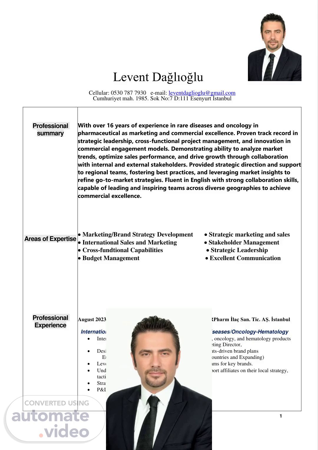 1 Levent Dağlıoğlu Cellular: 0530 787 7930 e-mail: [email protected] Cumhuriyet mah. 1985. Sok No:7 D:111 Esenyurt İstanbul Professional summary Areas of Expertise Professional Experience With over 16 years of experience in rare diseases and oncology in pharmaceutical as marketing and commercial excellence. Proven track record in strategic leadership, cross-functional project management, and innovation in commercial engagement models. Demonstrating ability to analyze market trends, optimize sales performance, and drive growth through collaboration with internal and external stakeholders. Provided strategic direction and support to regional teams, fostering best practices, and leveraging market insights to refine go-to-market strategies. Fluent in English with strong collaboration skills, capable of leading and inspiring teams across diverse geographies to achieve commercial excellence. • Marketing/Brand Strategy Development • Strategic marketing and sales • International Sales and Marketing • Stakeholder Management • Cross-fundtional Capabilities • Strategic Leadership • Budget Management • Excellent Communication August 2023 – Present TRPharm İlaç San. Tic. AŞ. İstanbul International Product & Marketing Manager- Rare Diseases/Oncology-Hematology • International Marketing management of Rare Disease, oncology, and hematology products o Reporting to the International Sales & Marketing Director, • Designing, managing and supporting marketing insights-driven brand plans Europe-Middle East-North Africa-LATAM (20+ Countries and Expanding) • Leveraging market insight and market research programs for key brands. • Understanding the local market reality/needs and support affiliates on their local strategy, tactics, and implementation plans • Strategic brand planning of newly launched products • P&L & Budget management.