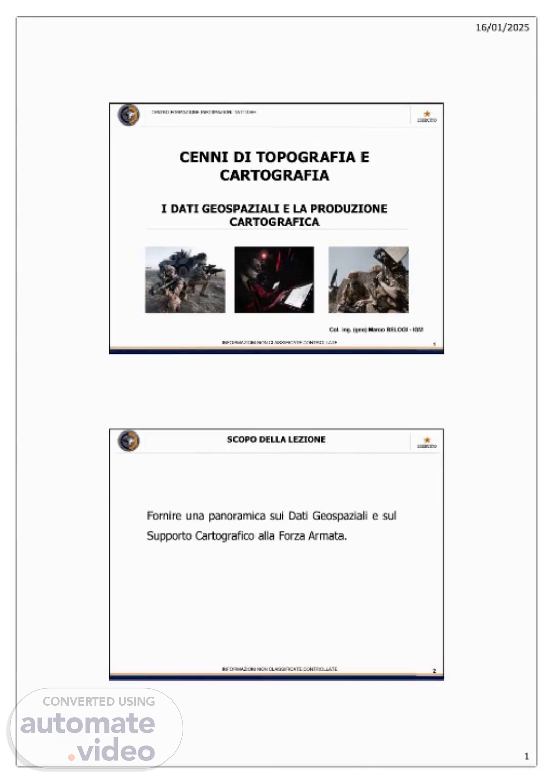 16/01/2025 1 1 INFORMAZIONI NON CLASSIFICATE CONTROLLATE CENNI DI TOPOGRAFIA E CARTOGRAFIA I DATI GEOSPAZIALI E LA PRODUZIONE CARTOGRAFICA CENTRO FORMAZIONE INFORMAZIONI TATTICHE Col. ing. (geo) Marco BELOGI - IGM 2 INFORMAZIONI NON CLASSIFICATE CONTROLLATE SCOPO DELLA LEZIONE Fornire una panoramica sui Dati Geospaziali e sul Supporto Cartografico alla Forza Armata..