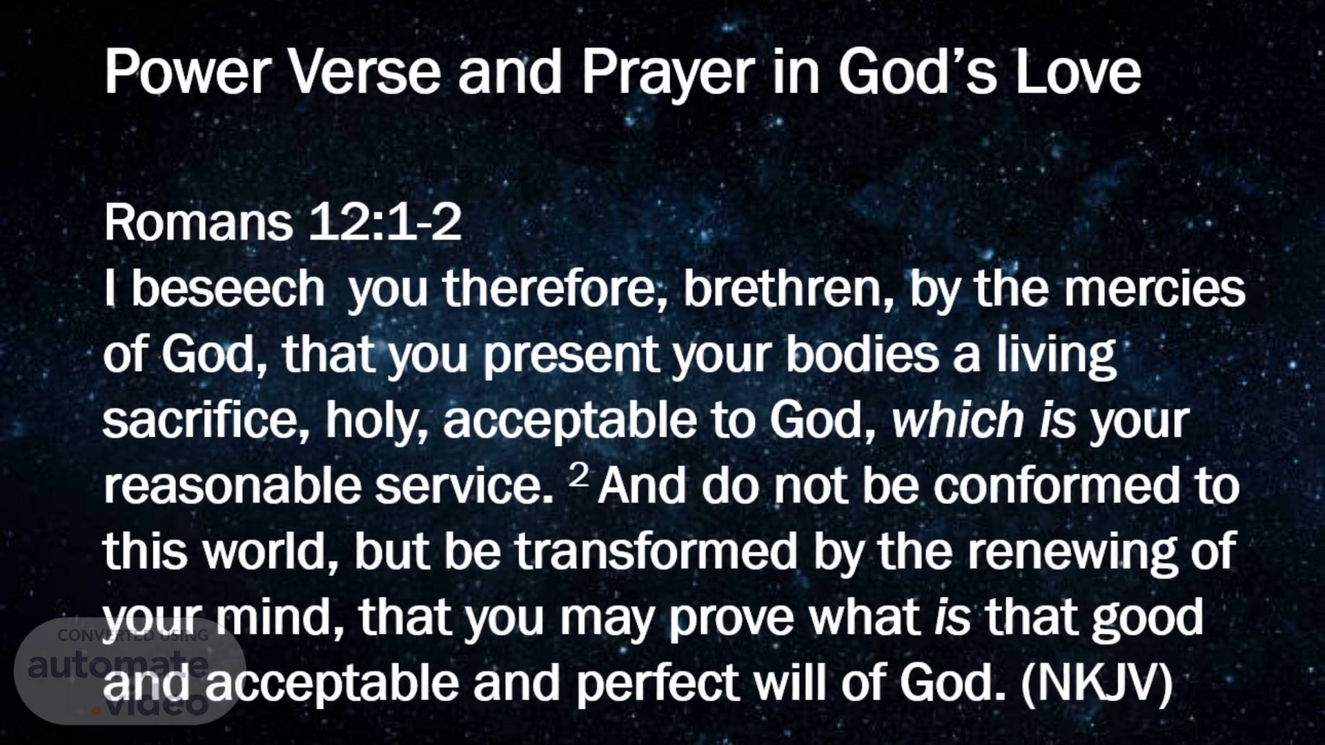[Virtual Presenter] Power Verse and Prayer in God’s Love Romans 12:1-2 I beseech you therefore, brethren, by the mercies of God, that you present your bodies a living sacrifice, holy, acceptable to God, which is your reasonable service. 2 And do not be conformed to this world, but be transformed by the renewing of your mind, that you may prove what is that good and acceptable and perfect will of God. (NKJV).