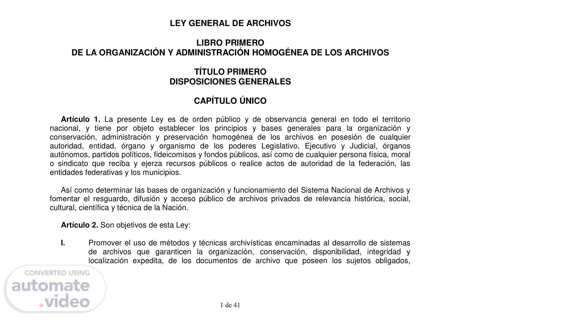 [Audio] La propiedad de estos documentos es pública y monumentos históricos. Por lo tanto, se les conservará y protegerán según los principios establecidos en esta ley. La preservación de estos documentos es esencial para el desarrollo de nuestras instituciones y la ejercicio de sus funciones. Por lo tanto, es necesario adoptar medidas para preservarlos, como adoptar medidas técnicas, administrativas, ambientales y tecnológicas para conservarlos. Además, la organización y conservación de los archivos deben respetar el orden de los documentos y la integridad de cada uno. Además, el acceso a los documentos debe garantizarse, permitiendo a cualquier persona consultarlos. Esto es esencial para el desarrollo de nuestras instituciones y el ejercicio de sus funciones..
