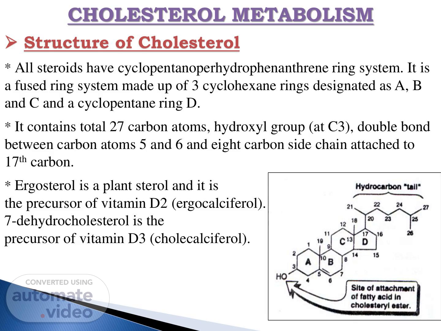 CHOLESTEROL METABOLISM ➢ Structure of Cholesterol * All steroids have cyclopentanoperhydrophenanthrene ring system. It is a fused ring system made up of 3 cyclohexane rings designated as A, B and C and a cyclopentane ring D. * It contains total 27 carbon atoms, hydroxyl group (at C3), double bond between carbon atoms 5 and 6 and eight carbon side chain attached to 17th carbon. * Ergosterol is a plant sterol and it is the precursor of vitamin D2 (ergocalciferol). 7-dehydrocholesterol is the precursor of vitamin D3 (cholecalciferol)..