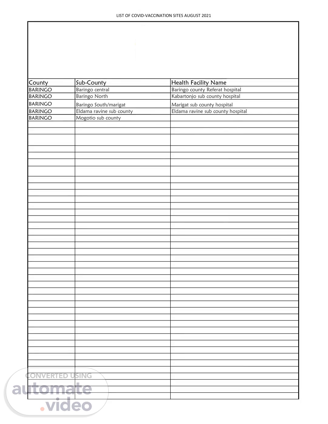 . . LIST OF COVID-VACCINATION SITES AUGUST 2021. County Sub-County Health Facility Name.