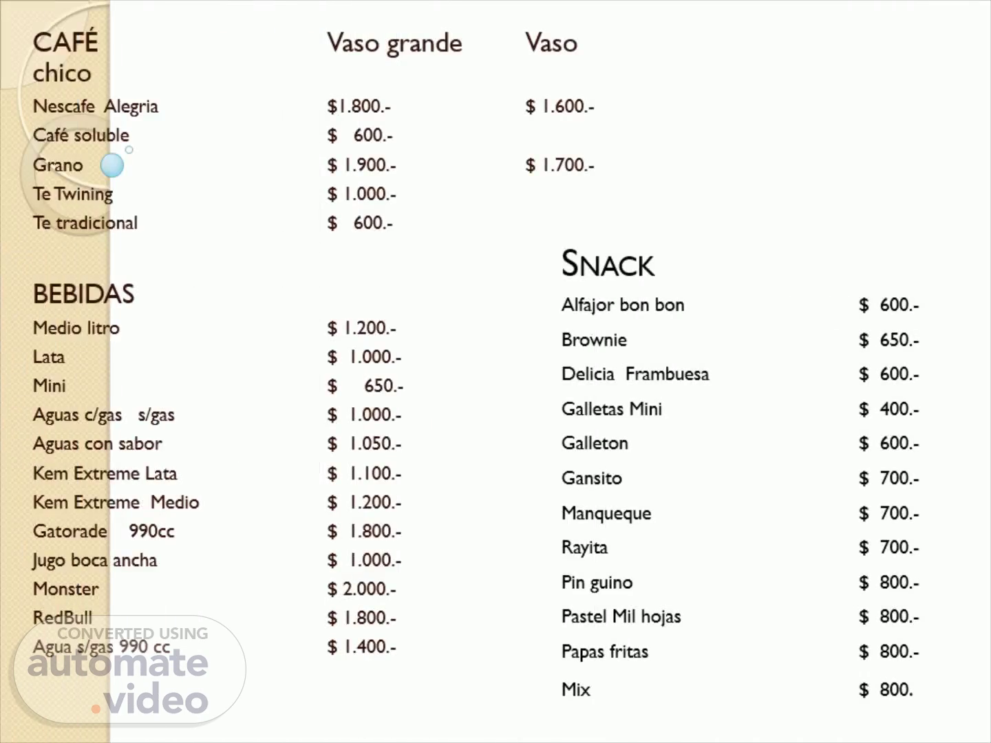 CAFÉ Vaso grande Vaso chico Nescafe Alegria $1.800.- $ 1.600.- Café soluble $ 600.- Grano $ 1.900.- $ 1.700.- Te Twining $ 1.000.- Te tradicional $ 600.- BEBIDAS Medio litro $ 1.200.- Lata $ 1.000.- Mini $ 650.- Aguas c/gas s/gas $ 1.000.- Aguas con sabor $ 1.050.- Kem Extreme Lata $ 1.100.- Kem Extreme Medio $ 1.200.- Gatorade 990cc $ 1.800.- Jugo boca ancha $ 1.000.- Monster $ 2.000.- RedBull $ 1.800.- Agua s/gas 990 cc $ 1.400.-.