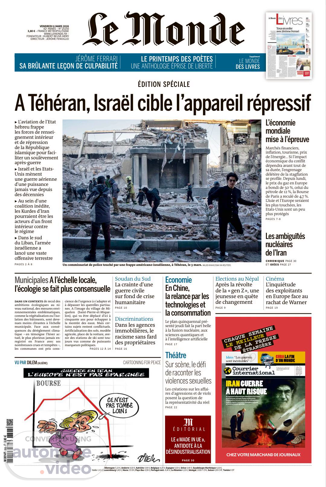 VENDREDI 6 MARS 2026 82E ANNÉE – NO 25250 3,80 € – FRANCE MÉTROPOLITAINE WWW.LEMONDE.FR – FONDATEUR : HUBERT BEUVE-MÉRY DIRECTEUR : JÉRÔME FENOGLIO Allemagne 5,10 €, Andorre 4,50 €, Autriche 4,90 €, Belgique 4,20 €, Espagne 4,50 €, Grèce 4,40 €, Guadeloupe-Martinique 4,10 €, Italie 4,40 €, Luxembourg 4,40 €, Maroc 35 DH, Pays-Bas 4,90 €, Portugal cont. 4,40 €, La Réunion 4,10 €, Sénégal 2 600 F CFA, Suisse 4,90 CHF, Tunisie 8 DT VU PAR DILEM (ALGÉRIE) CARTOONING FOR PEACE JÉRÔME FERRARI SA BRÛLANTE LEÇON DE CULPABILITÉ LE PRINTEMPS DES POÈTES UNE ANTHOLOGIE ÉPRISE DE LIBERTÉ Supplément LE MONDE DES LIVRES Les créations sur les affai- res d’agressions et de viols posent la question de la représentativité du réel PAGE 22 Théâtre Sur scène, le défi de raconter les violences sexuelles LE « MADE IN UE », ANTIDOTE À LA DÉSINDUSTRIALISATION PAGE 30 1 É D I T O R I A L dans un contexte de recul des ambitions écologiques au ni- veau national, des mesures envi- ronnementales emblématiques, comme la végétalisation ou l’iso- lation des bâtiments, sont deve- nues moins clivantes à l’échelle municipale. Face aux consé- quences du dérèglement clima- tique – en témoigne l’hiver ac- tuel, le plus pluvieux jamais en- registré en France avec ses nombreuses crues et tempêtes –, les communes ont pris cons- cience de l’urgence à s’adapter et à dépasser les querelles partisa- nes. A l’image du village de Mi- quelon (Saint-Pierre-et-Mique- lon), qui va être déplacé d’ici à cinquante ans pour échapper à la montée des eaux. Mais cer- tains sujets restent conflictuels. Artificialisation des sols, modèle agricole, place de la voiture, ave- nir des stations de ski sont tou- jours vus comme de puissants marqueurs politiques. PAGES 12 À 14 Un commissariat de police touché par une frappe américano-israélienne, à Téhéran, le 3 mars. MAJID KHAHI/ISNA VIA REUTERS Discriminations Dans les agences immobilières, le racisme sans fard des propriétaires PAGE 16 A Téhéran, Israël cible l’appareil répressif ▶ L’aviation de l’Etat hébreu frappe les forces de rensei- gnement intérieur et de répression de la République islamique pour faci- liter un soulèvement après-guerre ▶ Israël et les Etats- Unis mènent une guerre aérienne d’une puissance jamais vue depuis des décennies ▶ Au sein d’une coalition inédite, les Kurdes d’Iran pourraient être les acteurs d’un front intérieur contre le régime ▶ Dans le sud du Liban, l’armée israélienne a lancé une vaste offensive terrestre PAGES 2 À 8 Marchés financiers, inflation, tourisme, prix de l’énergie… Si l’impact économique du conflit dépendra avant tout de sa durée, l’engrenage délétère de la stagflation se profile. Depuis lundi, le prix du gaz en Europe a bondi de 50 %, celui du pétrole de 12 %, la Bourse de Paris a reculé de 4,7 %. L’Asie et l’Europe seraient les plus touchées, les Etats-Unis sont un peu plus protégés PAGES 7-8 L’économie mondiale mise à l’épreuve Chronique PAGE 30 ET idées PAGE 27 Les ambiguïtés nucléaires de l’Iran ÉDITION SPÉCIALE Le plan quinquennal pré- senté jeudi fait la part belle à la fusion nucléaire, aux sciences quantiques et à l’intelligence artificielle PAGE 17 Elections au Népal Après la révolte de la « gen Z », une jeunesse en quête de changement PAGE 9 Cinéma L’inquiétude des exploitants en Europe face au rachat de Warner PAGE 19 Soudan du Sud La crainte d’une guerre civile sur fond de crise humanitaire PAGE 10 Economie En Chine, la relance par les technologies et la consommation Municipales A l’échelle locale, l’écologie se fait plus consensuelle CHEZ VOTRE MARCHAND DE JOURNAUX En frappant la République islamique et en tuant Ali Khamenei, Donald Trump et Benyamin Nétanyahou ont pris le risque de déstabiliser toute la région. La presse étrangère redoute un embrasement général. IRAN GUERRE À HAUT RISQUE Allemagne 6,60 €, Andorre 6,20 €, Canada 9,50 $CAN, DOM 5,50 €, Espagne 5,90 €, Grande-Bretagne 5,90 £, Grèce 6 €, Italie 5,90 €, Japon 1 400 ¥, Maroc 52 DH, Pays-Bas 6,40 €, Portugalcont. 5,90 €, Sénégal 3 800 XOF, Suisse 7,30 CHF, TOM 1 200 XPF, Tunisie 13 DT, Afriqueautres 3 800 F CFA No 1844 du 5 au 11 mars 2026 courrierinternational.com France : 5,20 € CUBA LA FIN D’UN MONDE CUBA D’UN MONDE Idées “Les guerres sont inévitables” CHAQUE SEMAINE LE MEILLEUR DE LA PRESSE ÉTRANGÈRE.