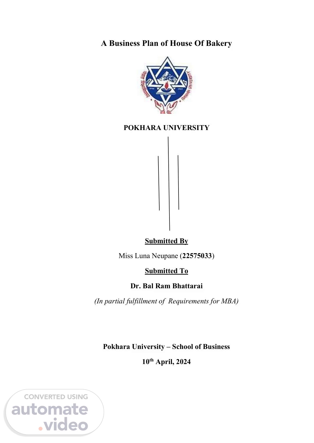 A Business Plan of House Of Bakery POKHARA UNIVERSITY Submitted By Miss Luna Neupane (22575033) Submitted To Dr. Bal Ram Bhattarai (In partial fulfillment of Requirements for MBA) Pokhara University – School of Business 10th April, 2024.