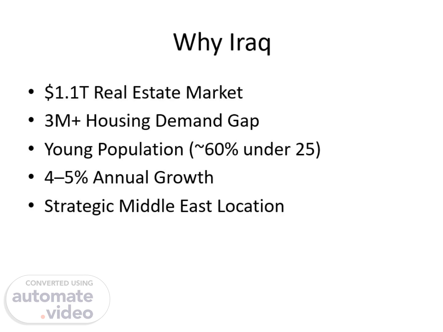 Why Iraq. $1.1T Real Estate Market 3M+ Housing Demand Gap Young Population (~60% under 25) 4–5% Annual Growth Strategic Middle East Location.