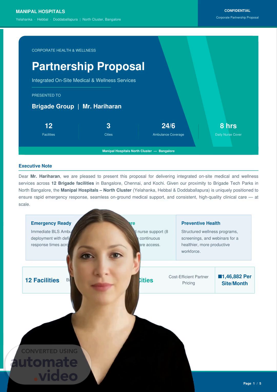 [Virtual Presenter] The partnership between Manipal Hospitals and Brigade Group will focus on corporate health and wellness services. This partnership aims to provide integrated on-site medical and wellness services at 12 Brigade facilities located in Bangalore, Chennai, and Kochi. Manipal Hospitals has chosen specific locations within the North Cluster in Yelahanka, Hebbal, and Doddaballapura as ideal sites for delivering rapid emergency response, smooth on-ground medical support, and consistent clinical care. The proposed services include structured wellness programs, trained nursing staff, and well-defined service level agreements. The partnership seeks to offer cost-effective solutions for Brigade Group, with monthly fees ranging from ₹1,46,882 per facility. The emphasis is placed on providing employees with easy access to healthcare, preventing illnesses, and fostering a healthier and more productive workforce..