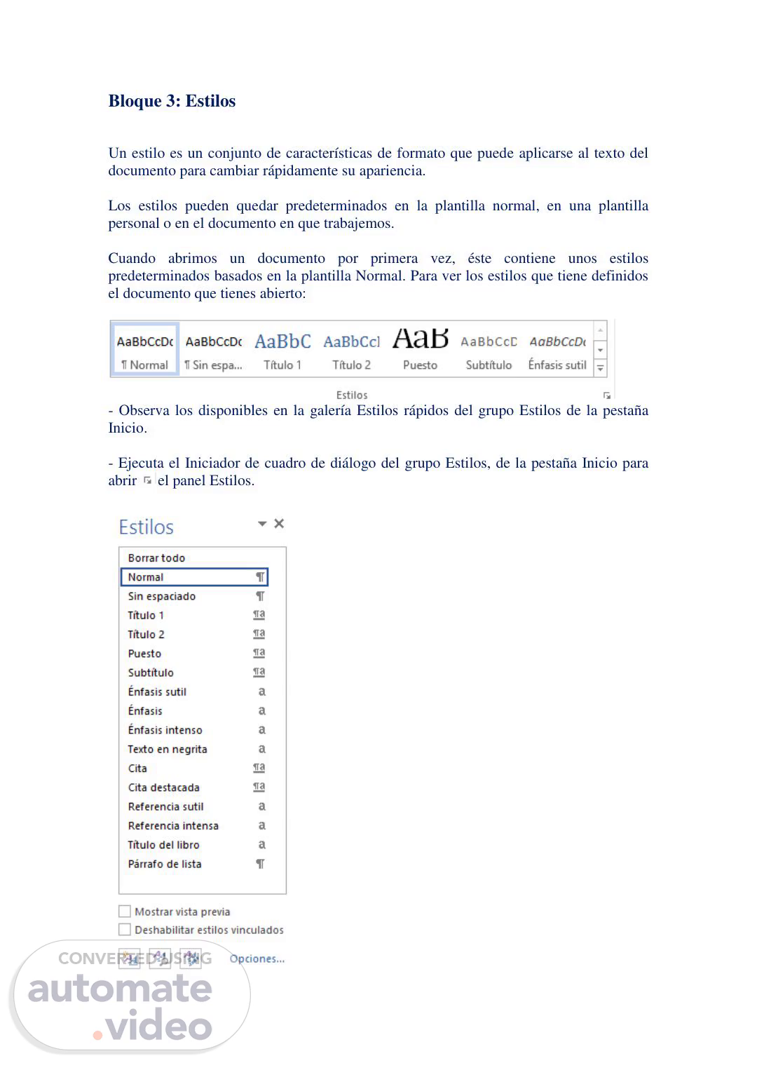 [Virtual Presenter] Bloque 3: Estilos Un estilo es un conjunto de características de formato que puede aplicarse al texto del documento para cambiar rápidamente su apariencia. Los estilos pueden quedar predeterminados en la plantilla normal, en una plantilla personal o en el documento en que trabajemos. Cuando abrimos un documento por primera vez, éste contiene unos estilos predeterminados basados en la plantilla Normal. Para ver los estilos que tiene definidos el documento que tienes abierto: - Observa los disponibles en la galería Estilos rápidos del grupo Estilos de la pestaña Inicio. - Ejecuta el Iniciador de cuadro de diálogo del grupo Estilos, de la pestaña Inicio para abrir el panel Estilos..