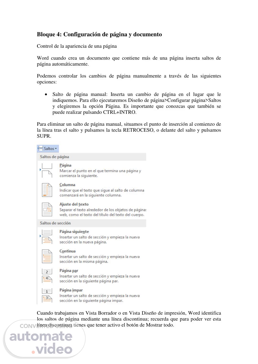 [Virtual Presenter] Bloque 4: Configuración de página y documento Control de la apariencia de una página Word cuando crea un documento que contiene más de una página inserta saltos de página automáticamente. Podemos controlar los cambios de página manualmente a través de las siguientes opciones: Salto de página manual: Inserta un cambio de página en el lugar que le indiquemos. Para ello ejecutaremos Diseño de página>Configurar página>Saltos y elegiremos la opción Página. Es importante que conozcas que también se puede realizar pulsando CTRL+INTRO. Para eliminar un salto de página manual, situamos el punto de inserción al comienzo de la línea tras el salto y pulsamos la tecla RETROCESO, o delante del salto y pulsamos SUPR. Cuando trabajamos en Vista Borrador o en Vista Diseño de impresión, Word identifica los saltos de página mediante una línea discontinua; recuerda que para poder ver esta línea discontinua tienes que tener activo el botón de Mostrar todo..