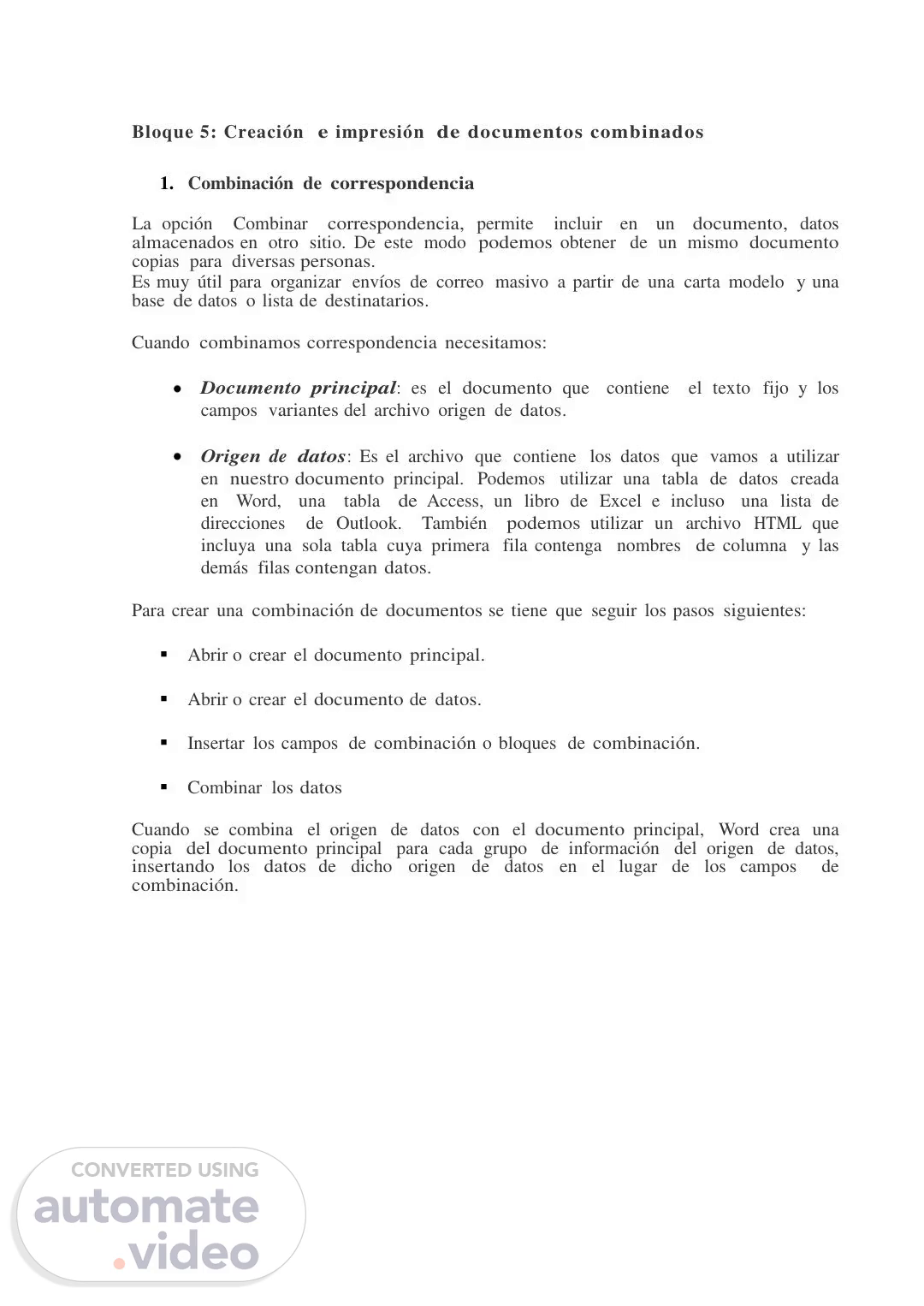 [Virtual Presenter] Bloque 5: Creación e impresión de documentos combinados 1. Combinación de correspondencia La opción Combinar correspondencia, permite incluir en un documento, datos almacenados en otro sitio. De este modo podemos obtener de un mismo documento copias para diversas personas. Es muy útil para organizar envíos de correo masivo a partir de una carta modelo y una base de datos o lista de destinatarios. Cuando combinamos correspondencia necesitamos: Documento principal: es el documento que contiene el texto fijo y los campos variantes del archivo origen de datos. Origen de datos: Es el archivo que contiene los datos que vamos a utilizar en nuestro documento principal. Podemos utilizar una tabla de datos creada en Word, una tabla de Access, un libro de Excel e incluso una lista de direcciones de Outlook. También podemos utilizar un archivo HTML que incluya una sola tabla cuya primera fila contenga nombres de columna y las demás filas contengan datos. Para crear una combinación de documentos se tiene que seguir los pasos siguientes: Abrir o crear el documento principal. Abrir o crear el documento de datos. Insertar los campos de combinación o bloques de combinación. Combinar los datos Cuando se combina el origen de datos con el documento principal, Word crea una copia del documento principal para cada grupo de información del origen de datos, insertando los datos de dicho origen de datos en el lugar de los campos de combinación..