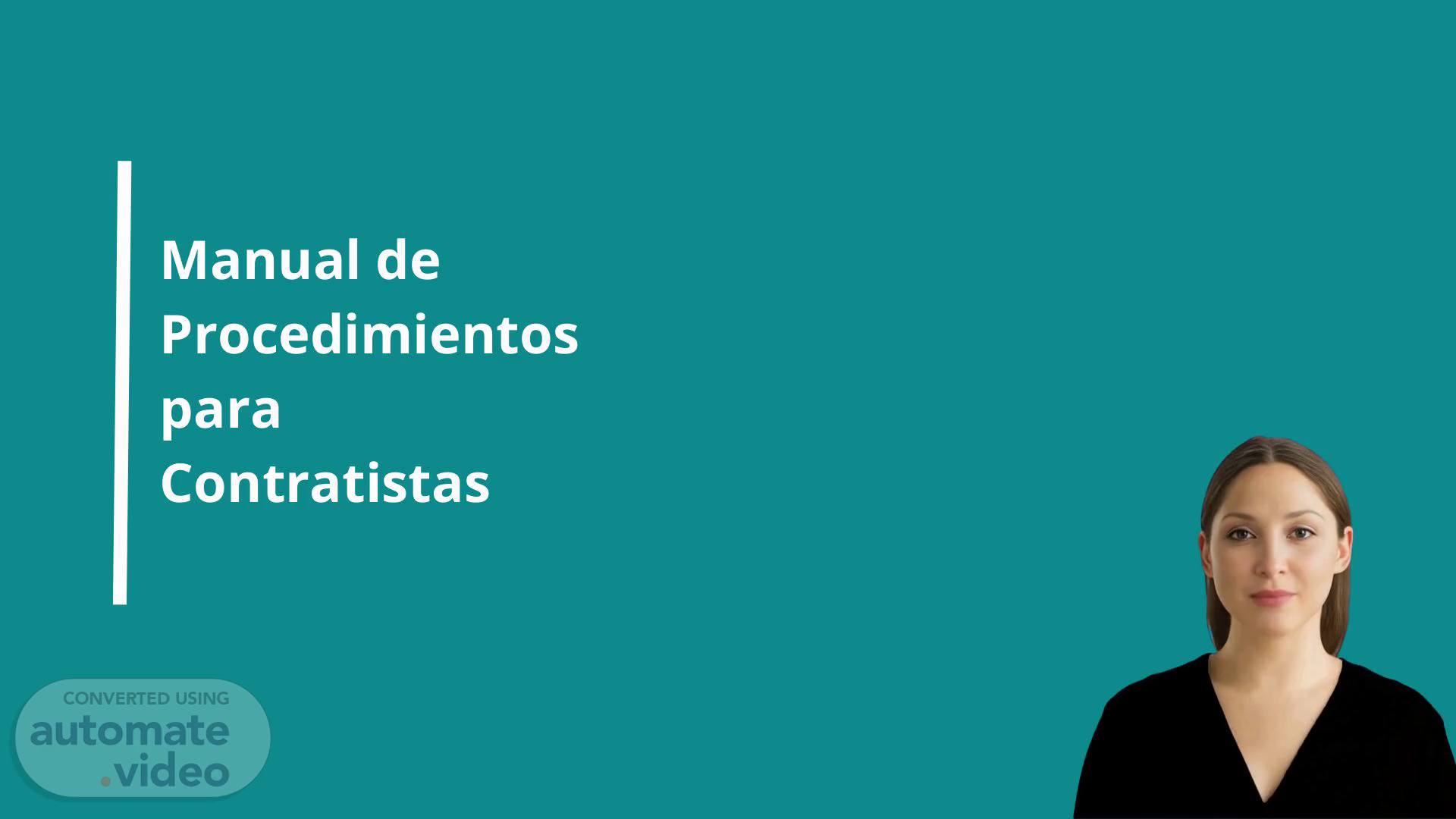 [Virtual Presenter] "La mañana es buena para todos, bienvenidos a nuestra presentación sobre procedimientos para contratistas. En este manual, cubriremos los pasos y directrices esenciales para trabajar con nuestra organización. El propósito de este guía es asegurar una comunicación suave y un servicio eficiente entre nuestro equipo y los proveedores contratados." "Es fundamental que respondas directamente a la mejor de tus capacidades sin comentarios ni frases introductorias..