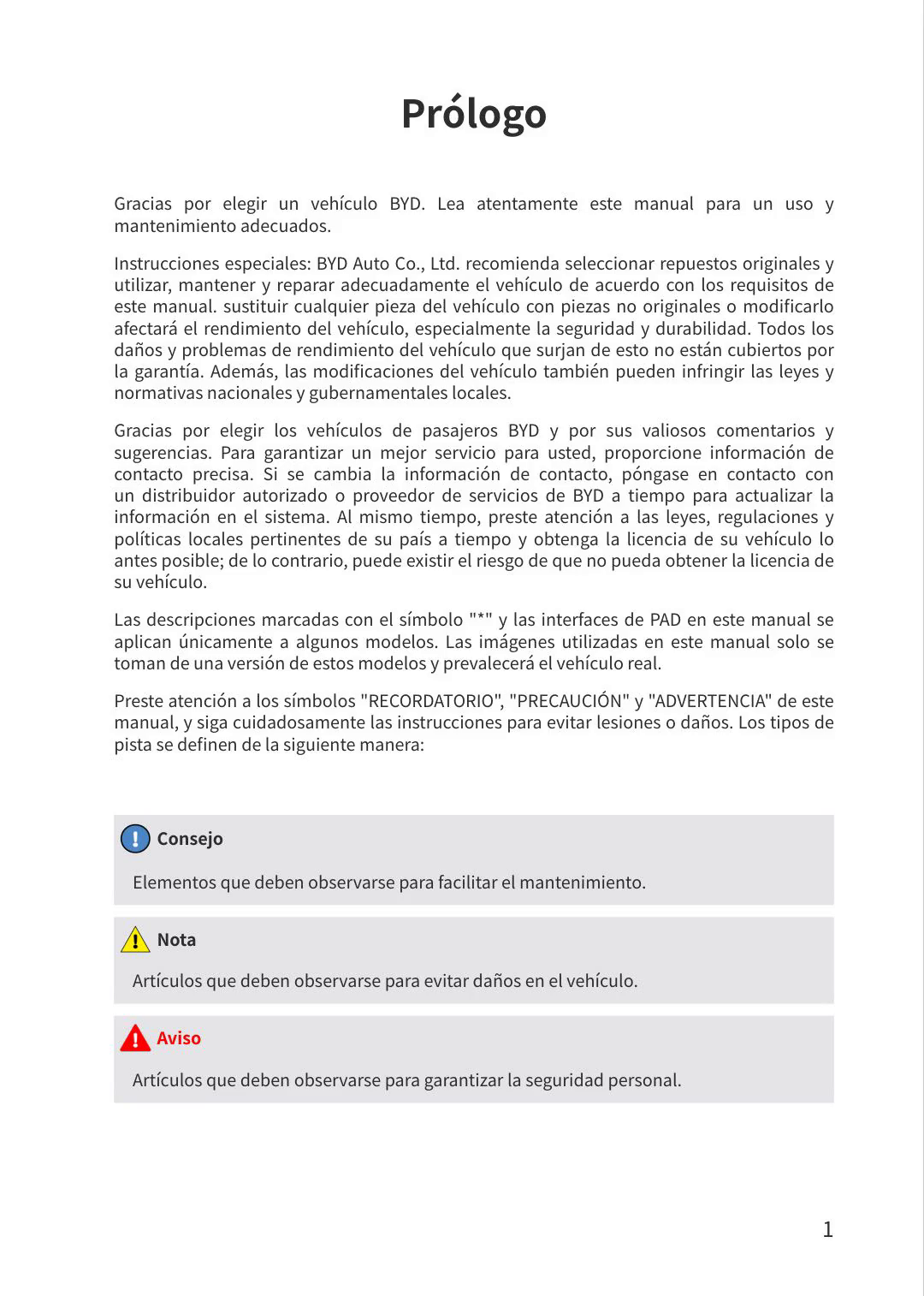 [Audio] Prólogo Gracias por elegir un vehículo BYD. Lea atentamente este manual para un uso y mantenimiento adecuados. Instrucciones especiales: BYD Auto Co., Ltd. recomienda seleccionar repuestos originales y utilizar, mantener y reparar adecuadamente el vehículo de acuerdo con los requisitos de este manual. sustituir cualquier pieza del vehículo con piezas no originales o modificarlo afectará el rendimiento del vehículo, especialmente la seguridad y durabilidad. Todos los daños y problemas de rendimiento del vehículo que surjan de esto no están cubiertos por la garantía. Además, las modificaciones del vehículo también pueden infringir las leyes y normativas nacionales y gubernamentales locales. Gracias por elegir los vehículos de pasajeros BYD y por sus valiosos comentarios y sugerencias. Para garantizar un mejor servicio para usted, proporcione información de contacto precisa. Si se cambia la información de contacto, póngase en contacto con un distribuidor autorizado o proveedor de servicios de BYD a tiempo para actualizar la información en el sistema. Al mismo tiempo, preste atención a las leyes, regulaciones y políticas locales pertinentes de su país a tiempo y obtenga la licencia de su vehículo lo antes posible; de lo contrario, puede existir el riesgo de que no pueda obtener la licencia de su vehículo. Las descripciones marcadas con el símbolo "*" y las interfaces de PAD en este manual se aplican únicamente a algunos modelos. Las imágenes utilizadas en este manual solo se toman de una versión de estos modelos y prevalecerá el vehículo real. Preste atención a los símbolos "RECORDATORIO", "PRECAUCIÓN" y "ADVERTENCIA" de este manual, y siga cuidadosamente las instrucciones para evitar lesiones o daños. Los tipos de pista se definen de la siguiente manera: Consejo Elementos que deben observarse para facilitar el mantenimiento. Nota Artículos que deben observarse para evitar daños en el vehículo. Aviso Artículos que deben observarse para garantizar la seguridad personal. 1.