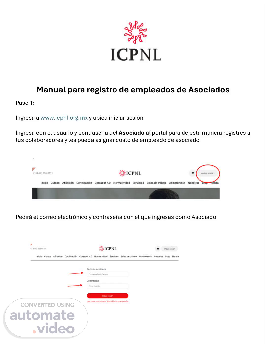 [Virtual Presenter] Manual para registro de empleados de Asociados Paso 1: Ingresa a www.icpnl.org.mx y ubica iniciar sesión Ingresa con el usuario y contraseña del Asociado al portal para de esta manera registres a tus colaboradores y les pueda asignar costo de empleado de asociado. Pedirá el correo electrónico y contraseña con el que ingresas como Asociado.