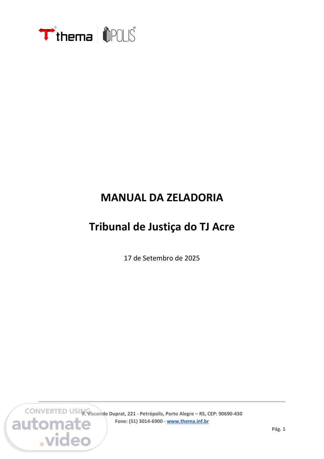 [Audio] MANUAL DA ZELADORIA Tribunal de Justiça do TJ Acre 17 de Setembro de 2025 R. Visconde Duprat, 221 - Petrópolis, Porto Alegre – RS, CEP: 90690-430 Fone: (51) 3014-6900 - www.thema.inf.br Pág. 1.