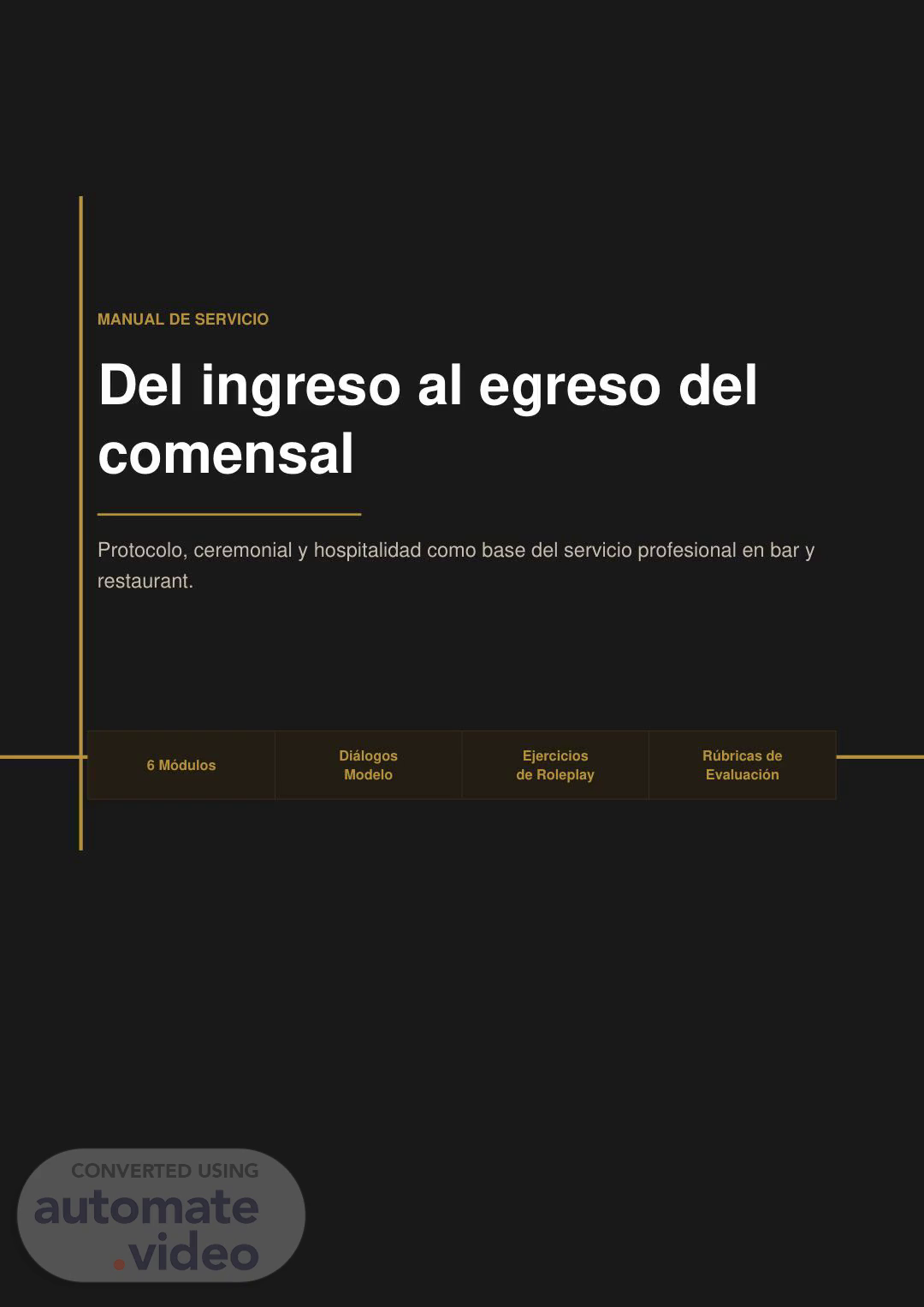[Audio] MANUAL DE SERVICIO Del ingreso al egreso del comensal Protocolo, ceremonial y hospitalidad como base del servicio profesional en bar y restaurant. 6 Módulos Diálogos Modelo Ejercicios de Roleplay Rúbricas de Evaluación.