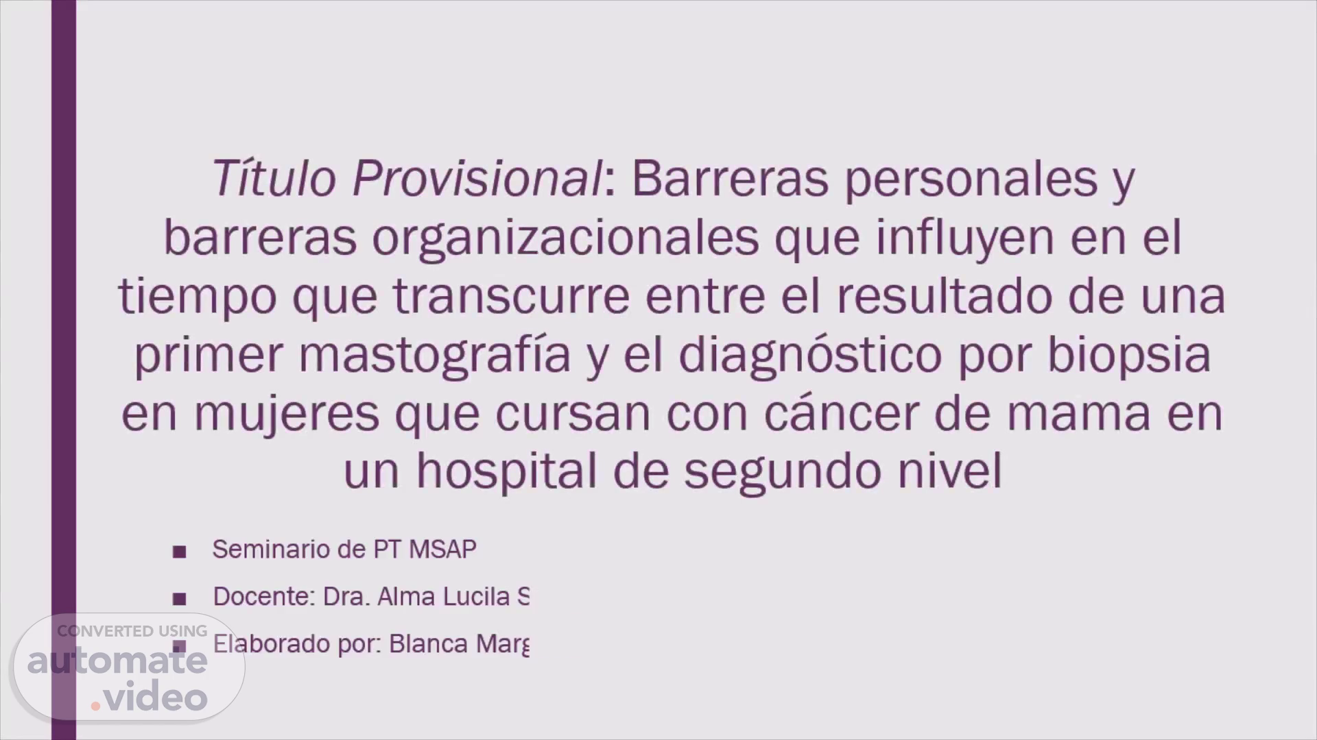 Título Provisional : Barreras personales y barreras organizacionales que influyen en el tiempo que transcurre entre el resultado de una primer mastografía y el diagnóstico por biopsia en mujeres que cursan con cáncer de mama en un hospital de segundo nivel.