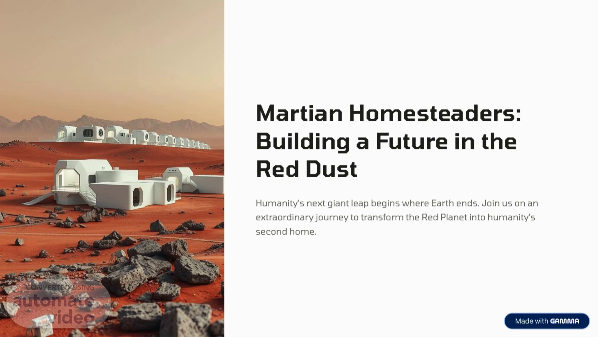 Martian Homesteaders: Building a Future in the Red Dust Humanity's next giant leap begins where Earth ends. Join us on an extraordinary journey to transform the Red Planet into humanity's second home..