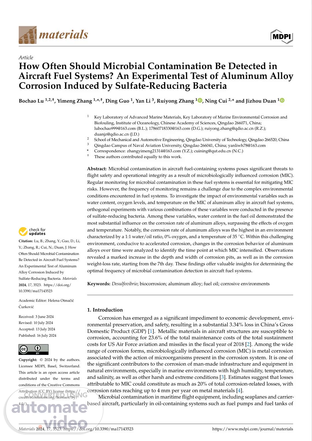 [Audio] materials Article How Often Should Microbial Contamination Be Detected in Aircraft Fuel Systems? An Experimental Test of Aluminum Alloy Corrosion Induced by Sulfate-Reducing Bacteria Bochao Lu 1,2,†, Yimeng Zhang 1,*,†, Ding Guo 1, Yan Li 3, Ruiyong Zhang 1 , Ning Cui 2,* and Jizhou Duan 1 1 Key Laboratory of Advanced Marine Materials, Key Laboratory of Marine Environmental Corrosion and Biofouling, Institute of Oceanology, Chinese Academy of Sciences, Qingdao 266071, China; [email protected] (B L ); [email protected] (D G ); [email protected] (R Z ); [email protected] (J D ) 2 School of Mechanical and Automotive Engineering, Qingdao University of Technology, Qingdao 266520, China 3 Qingdao Campus of Naval Aviation University, Qingdao 266041, China; [email protected] * Correspondence: [email protected] (Y Z ); [email protected] (N C ) † These authors contributed equally to this work. Citation: Lu, B.; Zhang, Y.; Guo, D.; Li, Y.; Zhang, R.; Cui, N.; Duan, J How Often Should Microbial Contamination Be Detected in Aircraft Fuel Systems? An Experimental Test of Aluminum Abstract: Microbial contamination in aircraft fuel-containing systems poses significant threats to flight safety and operational integrity as a result of microbiologically influenced corrosion (M-I-C--). Regular monitoring for microbial contamination in these fuel systems is essential for mitigating M-I-C risks. However, the frequency of monitoring remains a challenge due to the complex environmental conditions encountered in fuel systems. To investigate the impact of environmental variables such as water content, oxygen levels, and temperature on the M-I-C of aluminum alloy in aircraft fuel systems, orthogonal experiments with various combinations of these variables were conducted in the presence of sulfate-reducing bacteria. Among these variables, water content in the fuel oil demonstrated the most substantial influence on the corrosion rate of aluminum alloys, surpassing the effects of oxygen and temperature. Notably, the corrosion rate of aluminum alloys was the highest in an environment characterized by a 1:1 water/oil ratio, 0% oxygen, and a temperature of 35 C Within this challenging environment, conducive to accelerated corrosion, changes in the corrosion behavior of aluminum alloys over time were analyzed to identify the time point at which M-I-C intensified. Observations revealed a marked increase in the depth and width of corrosion pits, as well as in the corrosion weight-loss rate, starting from the 7th day. These findings offer valuable insights for determining the optimal frequency of microbial contamination detection in aircraft fuel systems. Alloy Corrosion Induced by Sulfate-Reducing Bacteria. Materials Keywords: Desulfovibrio; biocorrosion; aluminum alloy; fuel oil; corrosive environments 2024, 17, 3523. doi 10.3390/ma17143523 Academic Editor: Helena Otmaˇci´c ´Curkovi´c 1. Introduction Received: 3 June 2024 Revised: 10 July 2024 Accepted: 13 July 2024 Published: 16 July 2024 Copyright: © 2024 by the authors. Licensee M-D-P-I-, Basel, Switzerland. This article is an open access article distributed under the terms and conditions of the Creative Commons Attribution (CC BY) license (https:// creativecommons.org/licenses/by/ 4.0/). Corrosion has emerged as a significant impediment to economic development, environmental preservation, and safety, resulting in a substantial 3.34% loss in China’s Gross Domestic Product (G-D-P--) [1]. Metallic materials in aircraft structures are susceptible to corrosion, accounting for 23.6% of the total maintenance costs of the total sustainment costs for U-S Air Force aviation and missiles in the fiscal year of 2018 [2]. Among the wide range of corrosion forms, microbiologically influenced corrosion (M-I-C--) is metal corrosion associated with the action of microorganisms present in the corrosion system. It is one of the significant contributors to the corrosion of man-made infrastructure and equipment in natural environments, especially in marine environments with high humidity, temperature, and salinity, as well as other harsh and extreme conditions [3]. Estimates suggest that losses attributable to M-I-C could constitute as much as 20% of total corrosion-related losses, with corrosion rates reaching up to 4 millimeters per year on metal materials [4]. Microbial contamination.