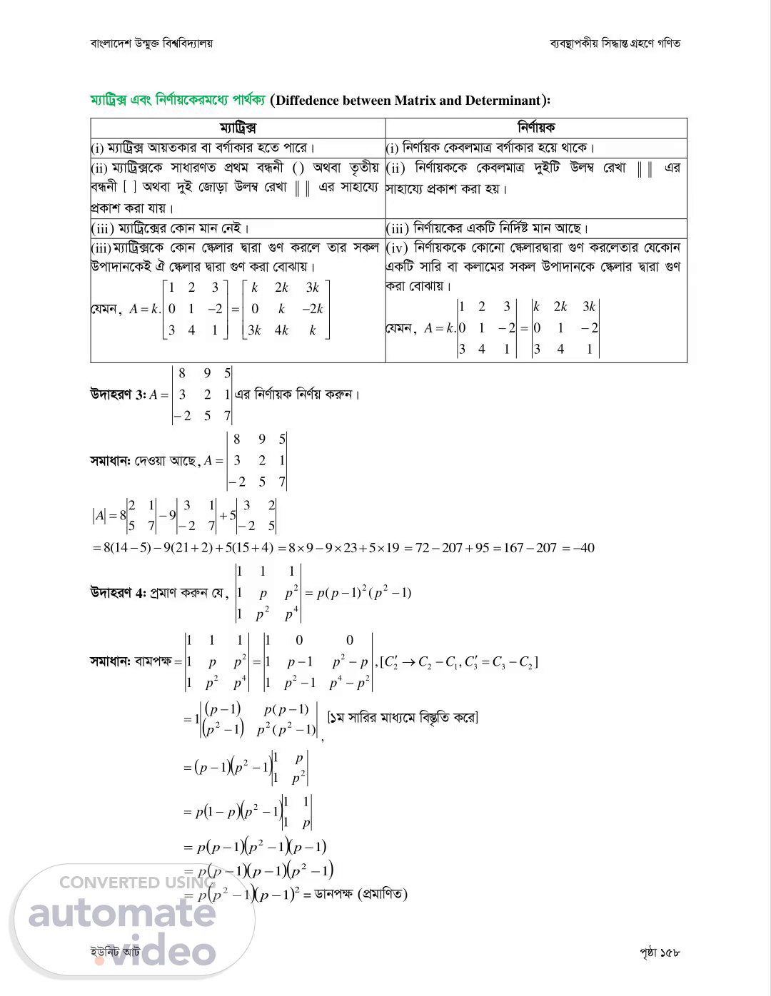 evsjv‡`k Dš§y³ wek^we`¨vjq e¨e¯’vcKxq wm×všÍ MÖn‡Y MwYZ BDwbU AvU c„ôv 158 g¨vwUª· Ges wbY©vq‡Kig‡a¨ cv_©K¨ (Diffedence between Matrix and Determinant): g¨vwUª· wbY©vqK (i) g¨vwUª· AvqZKvi ev eM©vKvi n‡Z cv‡i| (i) wbYv©qK †KejgvÎ eM©vKvi n‡q _v‡K| (ii) g¨vwUª·‡K mvaviYZ cÖ_g eÜbx () A_ev Z…Zxq eÜbx [ ] A_ev `yB †Rvov Dj¤^ †iLv Gi mvnv‡h¨ cÖKvk Kiv hvq| (ii) wbY©vqK‡K †KejgvÎ `yBwU Dj¤^ †iLv Gi mvnv‡h¨ cÖKvk Kiv nq| (iii) g¨vwUª‡·i †Kvb gvb †bB| (iii) wbY©vq‡Ki GKwU wbw`©ó gvb Av‡Q| (iii) g¨vwUª·‡K †Kvb †¯‹jvi Øviv ¸Y Ki‡j Zvi mKj Dcv`vb‡KB H †¯‹jvi Øviv ¸Y Kiv †evSvq| †hgb, 1 2 3 2 3 . 0 1 2 0 2 3 4 1 3 4 k k k A k k k k k k (v) (iv) wbY©vqK‡K †Kv‡bv †¯‹jviØviv ¸Y Ki‡jZvi †h‡Kvb GKwU mvwi ev Kjv‡gi mKj Dcv`vb‡K †¯‹jvi Øviv ¸Y Kiv †evSvq| †hgb, 1 4 3 2 1 0 3 2 1 4 3 2 1 0 3 2 1 . k k k k A D`vniY 3: 7 5 2 1 2 3 5 9 8 A Gi wbY©vqK wbY©q Kiæb| mgvavb: †`Iqv Av‡Q, 7 5 2 1 2 3 5 9 8 A 5 2 2 5 3 7 2 1 9 3 7 5 1 82 A 4) (5 15 2) 9(21 5) 8(14 9 23 5 19 8 9 95 207 72 167 207 40 D`vniY 4: cªgvY Kiæb †h, )1 )1 ( ( 1 1 1 1 1 2 2 4 2 2 p p p p p p p mgvavb: evgcÿ 2 2 2 2 1 3 3 2 2 4 2 4 2 1 1 1 1 0 0 1 1 1 , [ , ] 1 1 1 p p p p p C C C C C C p p p p p )1 ( 1 )1 ( 1 1 2 2 2 p p p p p p , [1g mvwii gva¨‡g we¯Í…wZ K‡i] 2 2 1 1 1 1 p p p p p p p p 1 1 1 1 1 2 1 1 1 2 p p p p 1 1 1 2 p p p p 2 2 1 1 p p p = Wvbcÿ (cÖgvwYZ).