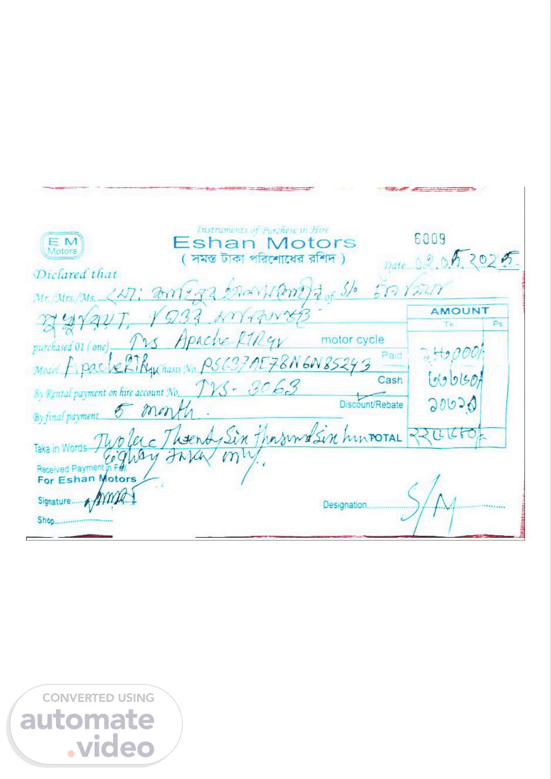 r•vn that Esha n Motors motor cycle AMOUNT C maya For Esha n otors Signature. She.. Cast•, Dscount/Reoate Desgnat:on..